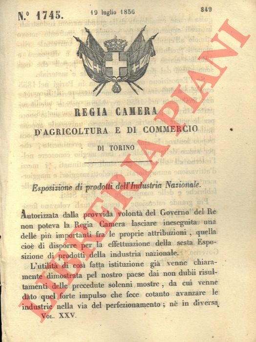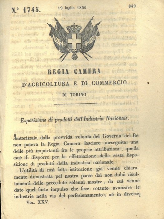 Torino, 1856, 19 Luglio, a firma Di Pollone, stemma reale xil. pp. 3