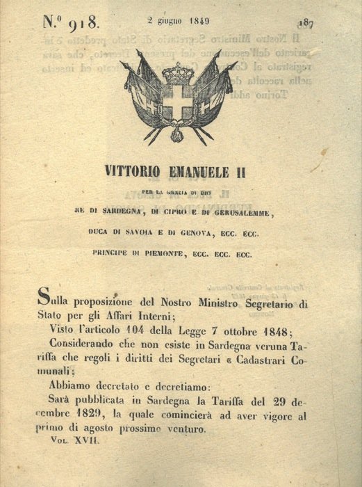 con cui si decide la pubblicazione in Sardegna della tariffa del 29 Dicembre che andrà in vigore dal 1 di Agosto del 1849.