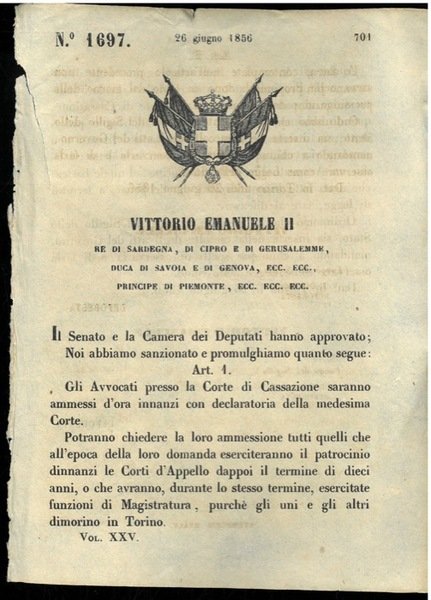 Torino, 1856, 26 Giugno, firma Vittorio Emanuele II, Deforesta, stemma reale xil. pp. 2