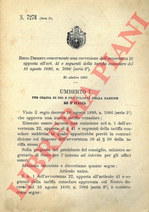 Monza, 1890, 25 ottobre, firma Umberto I, Crispi con stemma reale xil. pp. 2