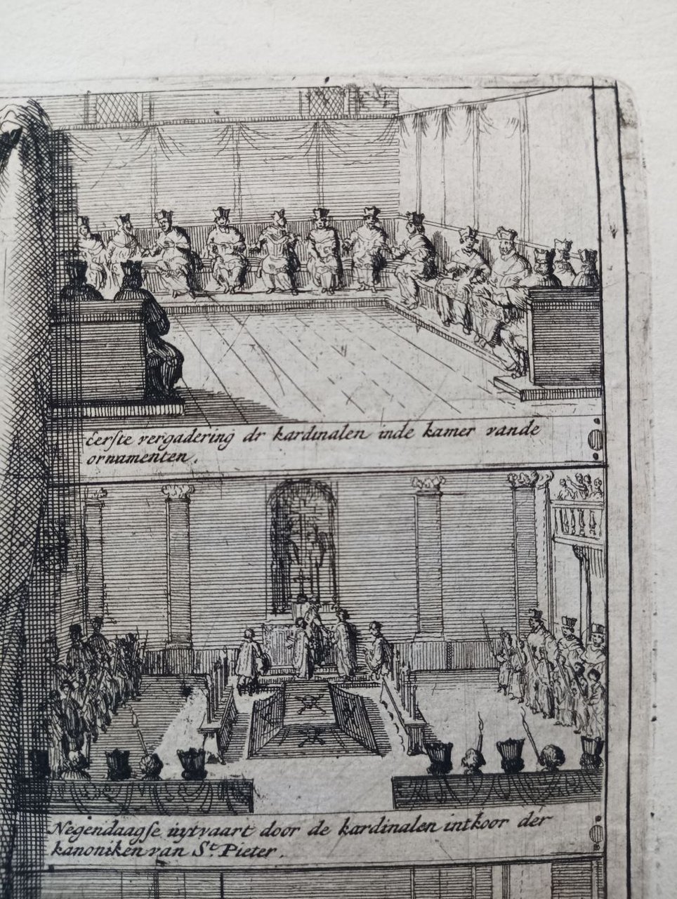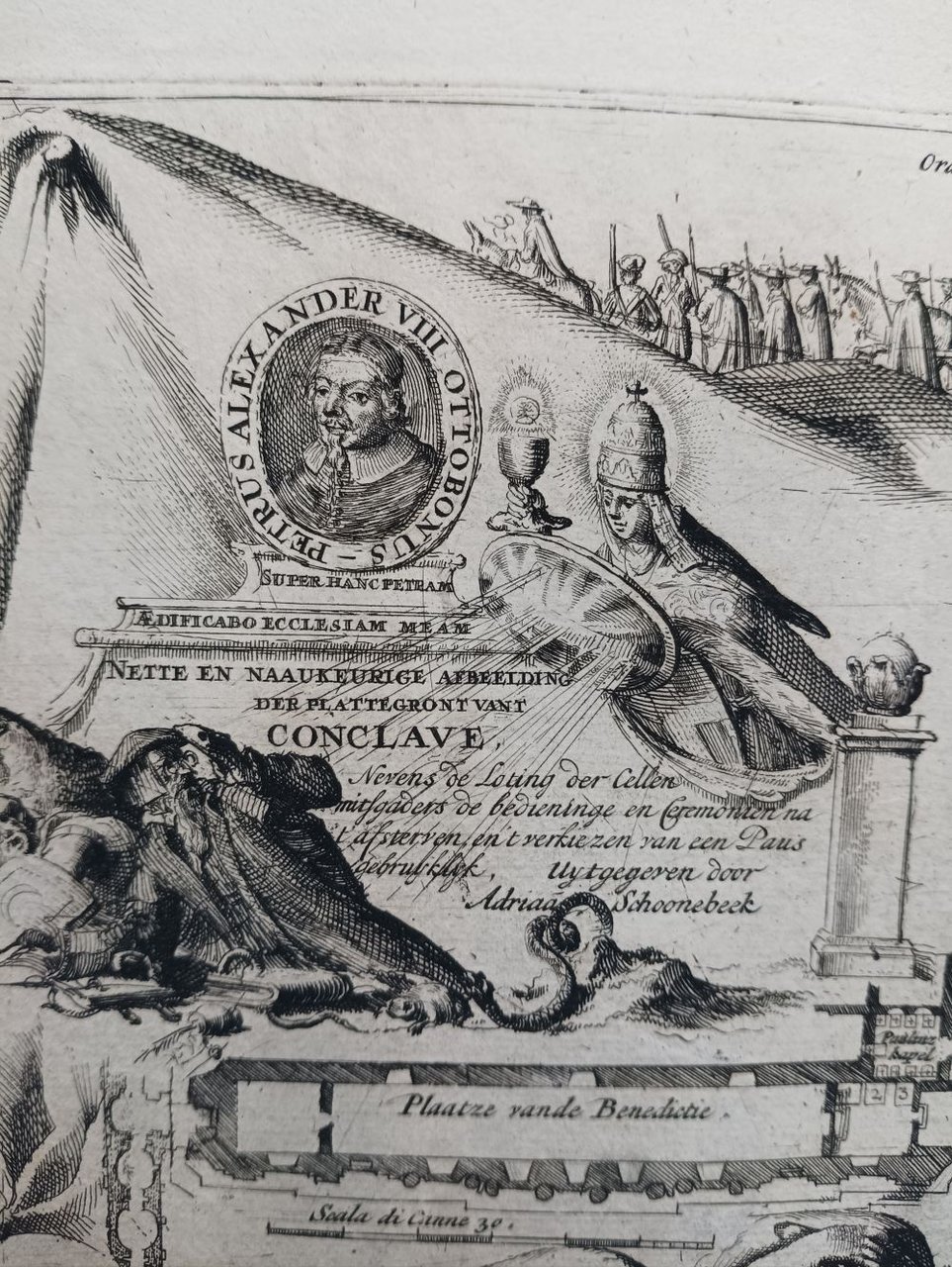 >Incisione originale su rame (mm 396 x 540 ed ampi margini) su carta vergellata, ad opera di Adriaan Schoonebeek, incisore olandese attivo ad Amsterdam dal 1688 e divenuto famoso con i ritratti di alcune personalità politiche e religiose, tra cui Alessandro VIII Ottoboni, eletto Papa nel 1689. Nell'incisione viene rappresentato il conclave al termine del quale venne eletto proprio Pietro Alessandro VIII, raffigurato in un cammeo in alto a sinistra. Subito sotto "nette en naauwkeurige afbeelding der flatte gron vant conclave" ("nitida e accurata rappresentazione del pianoro del conclave") e “nevens de loting der cellen mitsgaders de bediening een ceremonien na t'afsterven ent verkiezen van een Paris gebruykyk, uytgegeven door adriaa schoonebeek” ("oltre al disegno delle celle, così come il servizio e le cerimonie dopo la caduta di un candidato di Parigi, dato da Aadrian Schoonebeek").
