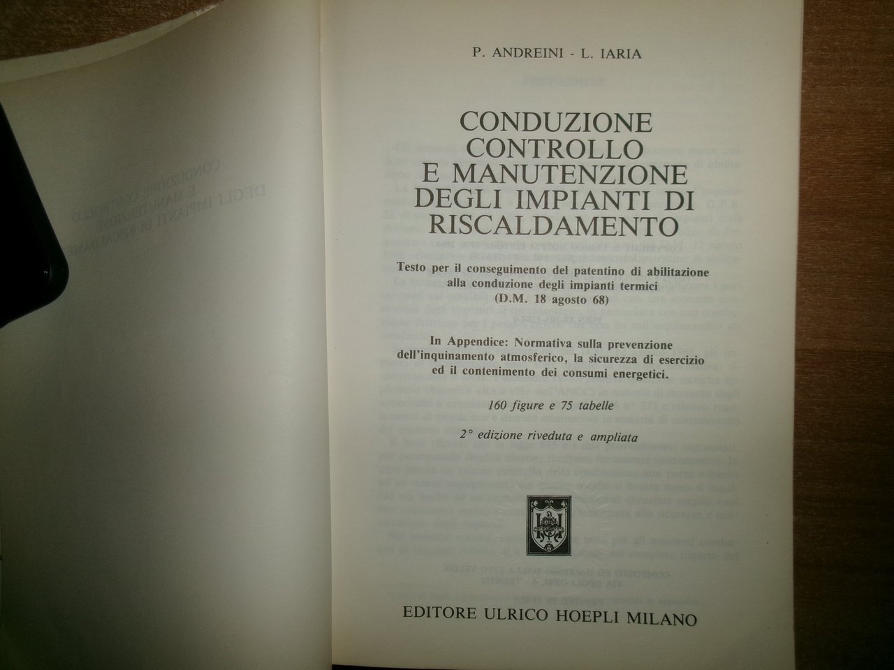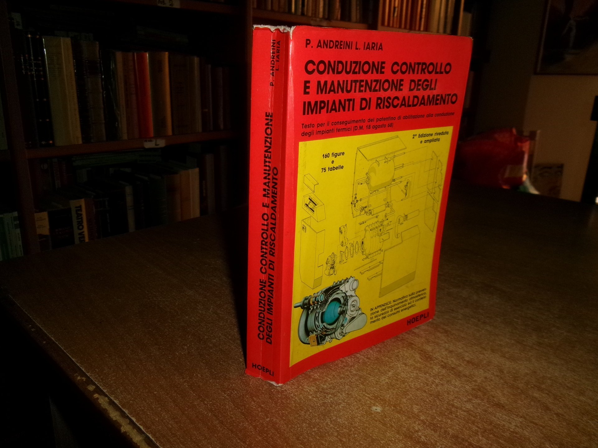 P. ANDREINI L, IARIA - Hoepli, 1984.TESTO PER IL CONSEGUIMENTO DEL PATENTINO DI ABILITAZIONE ALLA CONDUZIONE DEGLI IMPIANTI TERMICI. IN- 8°, 539 PP. 160 FIGURE E 75 TABELLE. SECONDA EDIZIONE RIVEDUTA E AMPLIATA. IN APPENDICE: NORMATIVA SULLA PREVENZIONE DELL' INQUINAMENTO ATMOSFERICO, LA SICUREZZA DI ESERCIZIO ED IL CONTENIMENTO DEI CONSUMI ENERGETICI. Ben conservato. Neg. magazz. mob. grigio entro busta trasp.