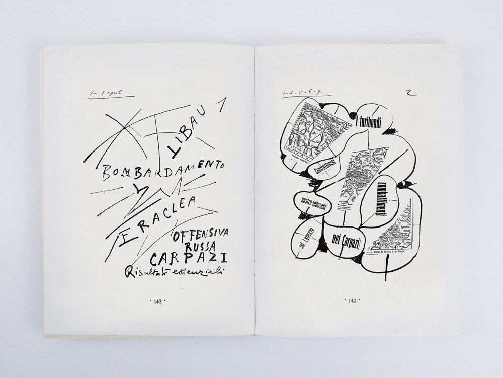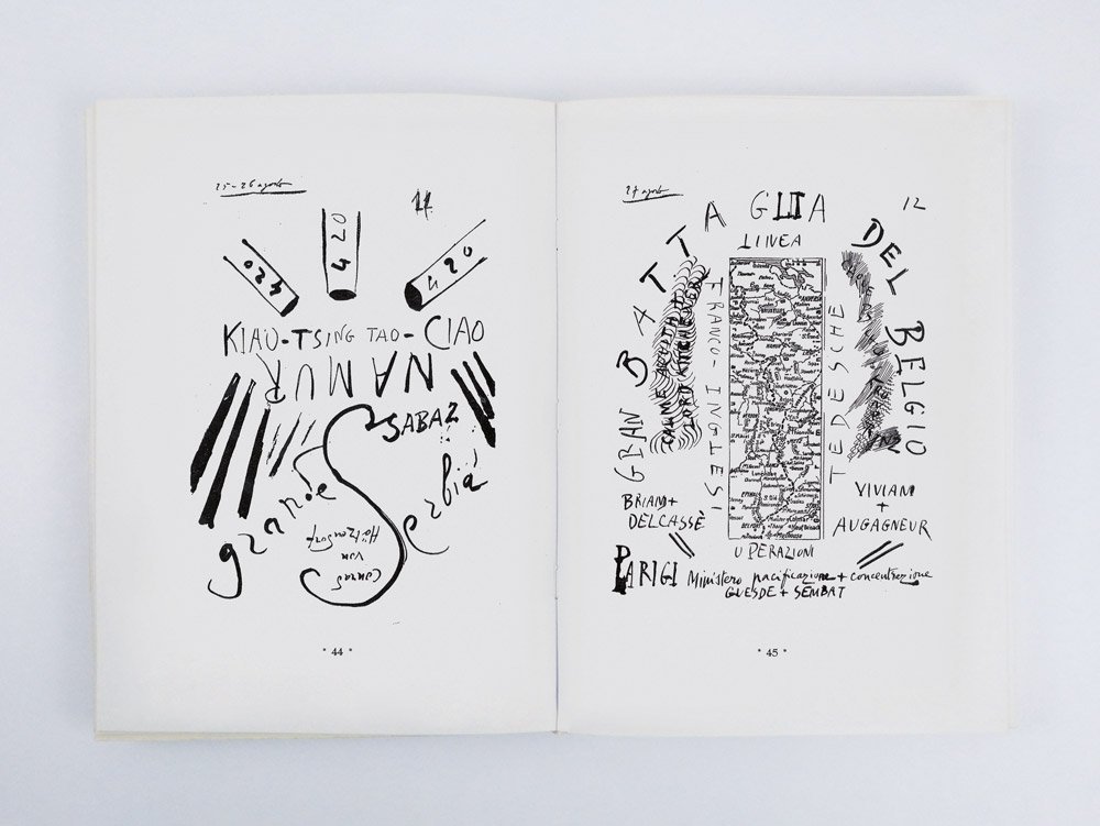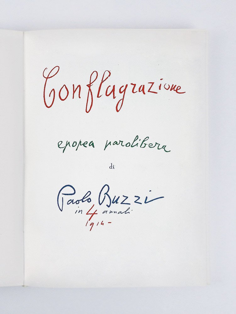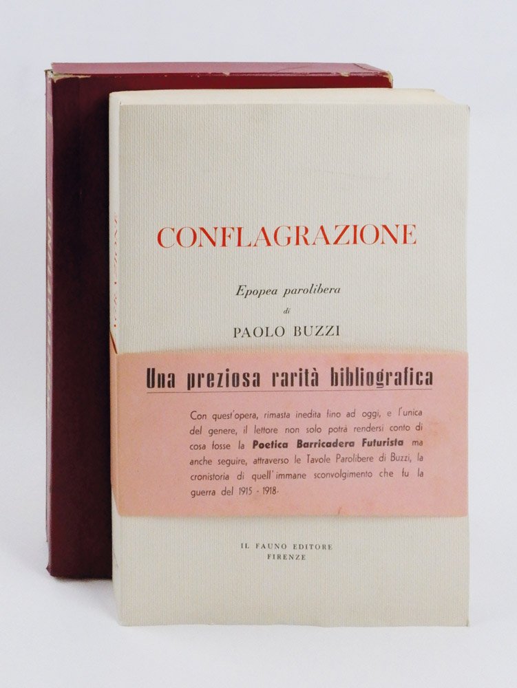 LIBROEdizione originale.Straordinario esemplare in condizioni perfette, completo di una rarissima fascetta editoriale stampata su fragile e sottilissima carta rosa, che recita: «Una preziosa rarità bibliografica. Con quest’opera, rimasta inedita fino ad oggi, e l’unica del genere, il lettore non solo potrà rendersi conto di cosa fosse la Poetica Barricadera Futurista ma anche seguire, attraverso le Tavole Parolibere di Buzzi, la cronistoria di quell’immane sconvolgimento che fu la guerra del 1915 - 1918»; l’esemplare è così ben conservato perché ancora entro il rarissimo cofanetto editoriale a conchiglia in simil pelle rossa, stampato in oro al dorso con autore, titolo cubitale ed editore al piede.Il «poema epico parolibero» «Conflagrazione», articolato in quasi trecento singole tavole — veri e propri quadri paroliberi — a cui Paolo Buzzi lavorò negli anni della Prima guerra mondiale, dal 1914 (la prima tavola conservata reca la data del 2 agosto, «L’ultimatum tedesco alla Russia e alla Francia») al 1918 (l’ultima tavola reca la data del 3 novembre 1918, armistizio di Villa Giusti) — non fu mai pubblicato, nonostante i reiterati annunci tra 1919 e 1920. Solo al principio degli anni Sessanta un gruppo di amici del poeta, in collaborazione con la moglie del poeta Maria Buzzi, concertò la presente edizione con le tavole riprodotte in tecnica fotostatica in un numero di copie limitate su carta uso mano» (oltre a quindici esemplari numerati su «carta a mano Fabriano» di color paglierino, rilegati). -- La mancata pubblicazione dell’opera all’epoca del suo concepimento e il tardivo omaggio costituito dall’edizione 1963 hanno fatto sì che questa stupefacente creazione sia rimasta completamente ignorata dagli storici e critici che — numerosi — si sono occupati delle parole in libertà futuriste e del rapporto tra futurismo e Prima guerra mondiale. «Information on this œuvre are amazingly scarce» lamentava giustamente Monica Biasiolo nel suo seminale saggio del 2012, il primo a gettare un po’ di luce su questo capolavoro dimenticato: «Lesser known than the works of these artists, if known at all, is “Conflagrazione. Epopea parolibera” by Paolo Buzzi, one of the most interesting works ever produced within the field of Futurism and one which actually exceeds it. The lack of its critical reception is caused by the delay of the publication of his volume and its scanty number of copies» (p. 181). -- Con «Conflagrazione» Buzzi sembra essere stato l’unico, tra i futuristi e i modernisti italiani, a comprendere che enormità ed eccezionalità della Grande Guerra comandavano un nuovo linguaggio, nuove forme espressive che né il verso libero e nemmeno lo sperimentalismo parolibero — già largamente utilizzato, alle soglie del 1915, dallo stesso Buzzi — potevano conseguire. Una rivoluzione linguistica che tuttavia non ebbe seguito, se non in questo in questo omaggio del 1963, qui in esemplare di eccezionale completezza.Cammarota, Futurismo, n. 68.36; Biasiolo, The Great War in the Words-in-Freedom Style of an Atypical Futurist: Conflagrazione by Paolo Buzzi (in: The History of Futurism, Lanham et al. 2012: 179-197); Come d’autunno: la Grande Guerra nella Raccolta Isolabella (Milano 2022), pp. 36-45 n. 45