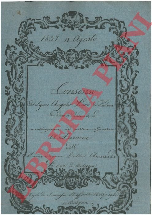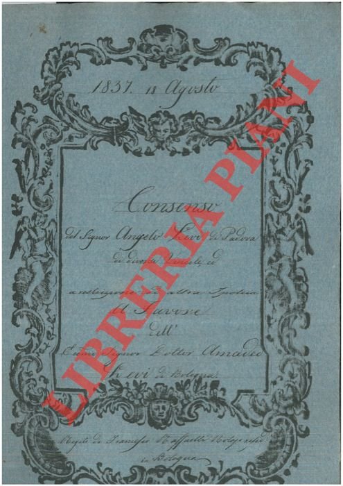 Bologna, 1837, agosto 18, rogito originale di 4 pp. in cartella con bella cornice xilografica, timbro a secco, firma del notaio Francesco Maffaelli di Bologna
