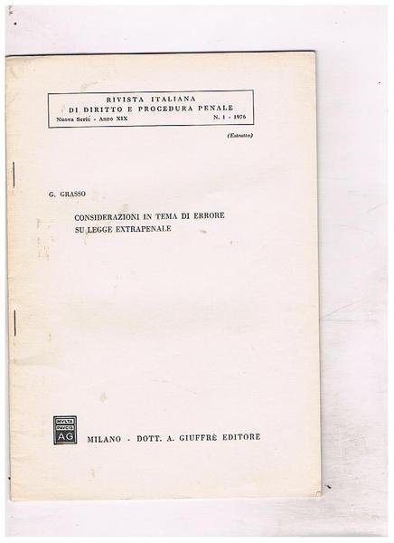 Considerazioni in tema di errore su Legge extrapenale. Estratto dalla Rivista di Diritto e Procedura Penale, nuova serie - anno XIX, n° 1 - 1976.