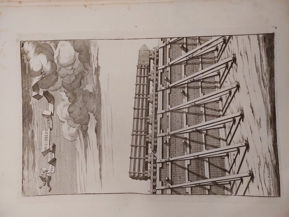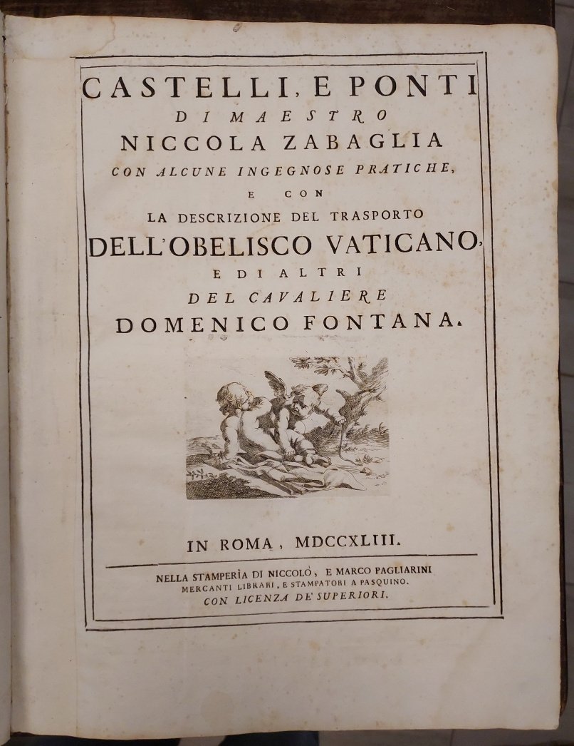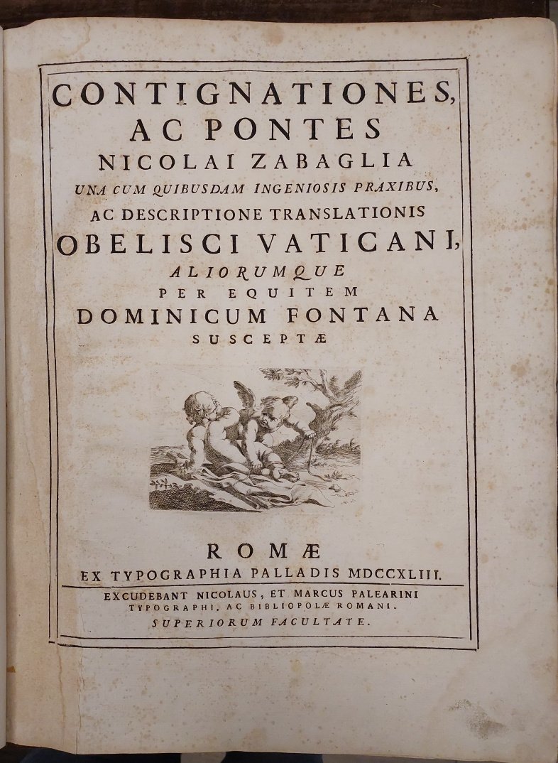 Contignationes, ac pontes... (segue altro foglio con titolo italiano) Castelli e ponti di Maestro Nicola Zabaglia, con alcune ingegnose pratiche, e con la descrizione del trasporto dell' Obelisco Vaticano, e di altri del cav. Domenico Fontana.