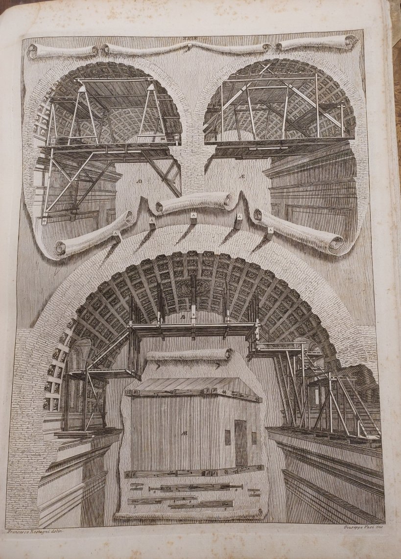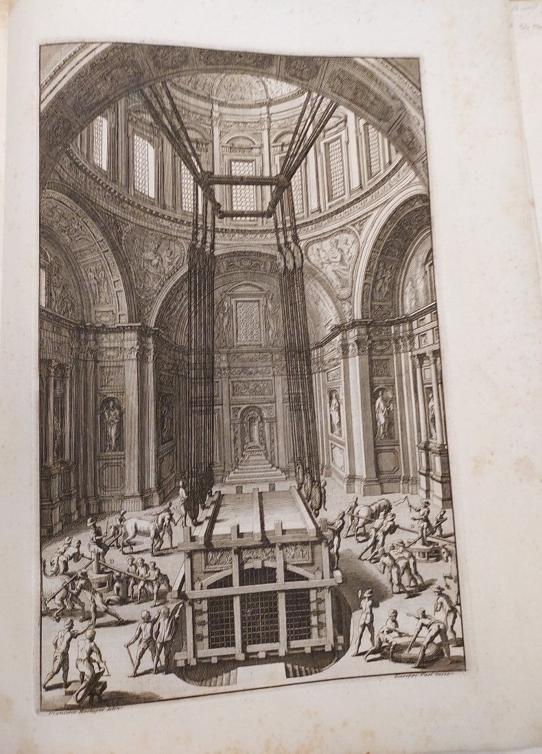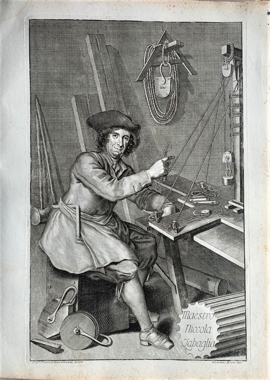 Magnifica ed importante opera di tecnica della costruzione e di architettura, riferita particolarmente all' edificazione dei grandi palazzi romani e del Vaticano. In essa mastro Nicola Zabaglia (1674-1760), che iniziò quale semplice ed illetterato muratore, espone le realizzazioni pratiche da lui ingegnosamente attuate. Stupendo il ritratto dis. da Ghezzi ed incise da G. Rossi; le belle e interessanti tavole raffig. varietà di ponteggi, scale, macchine, pulegge, mezzi di trasporto di materiali con cavalli ed operai, sono incise da Rostagni, Vasi, Specchi, Duflos ed altri. Prima edizione. Buon esemplare, malgrado fioriture e aloni al margine interno superiore e inferiore, antichi rinforzi della carta ai due titoli al foglio 1. Cicognara 968. Riccardi 642. Choix d' Olschki,18271.