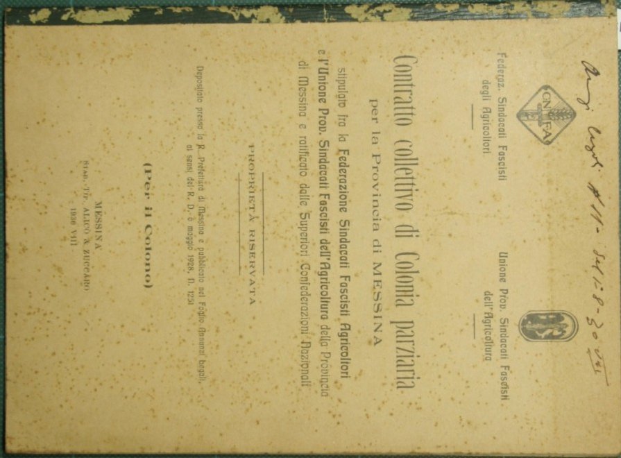 Stipulato fra la Federazione Sindacati Fascisti Agricoltori e l'Unione Prov. Sindacati Fascisti dell'Agricoltura della Provincia di Messina e ratificato dalle Superiori Confederazioni Nazionali - Per il colono - in 8° - pp.40 - Brossura editoriale - Fioriture e nota di possesso a penna alla brossura