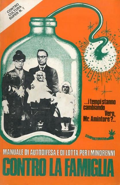 93 p. : ill. ; 22 x 14 cm. Controcultura super, 1. «Contro la famiglia è un manuale di autodifesa e di lotta scritto da e per compagni e fratelli giovanissimi che si son rotte le palle definitivamente della violenza, delle sopraffazioni, del vero e proprio nazismo quotidiano esercitato nei loro confronti innanzi tutto dalla famiglia e poi dalle altre istituzioni dello Stato clerico-fascista» (dalla quarta di copertina). Questo pamphlet, ormai entrato nella storia dell'underground italiano, ebbe un'eccezionale diffusione negli anni Settanta, anni di rivolte giovanili, conflitti di classe, di genere e di famiglia. . Brossura editoriale, coperta illustrata a colori in cartoncino flessibile plastificato. All'interno vari immagini e documenti in b/n. Codice libreria 9556.