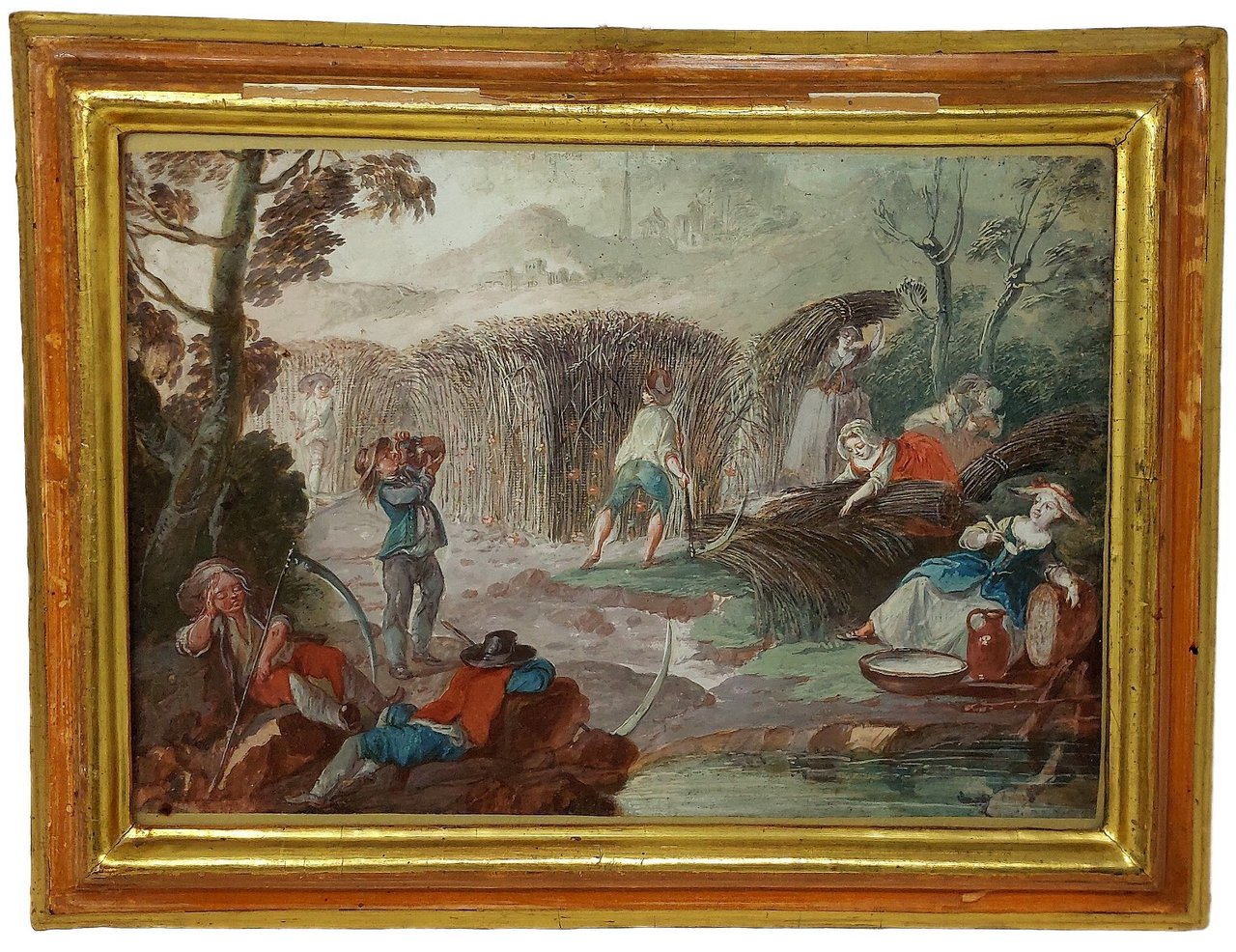 >Coppia di acquerelli con rialzi a tempera (mm 223x230), conservati in eleganti cornici dorate. Le scene sono animate da personaggi popolari intenti nello svolgimento delle loro attività quotidiane. Gli episodi illustrano, con tono ironico e realistico, scene di vita contadina e scene di genere ambientate in paesaggi rurali. Ogni soggetto rappresenta un momento particolare dell'anno, e lo delinea attraverso le attività agricole e sociali tipiche della stagione: la mietitura, la vendemmia. I personaggi sono caratterizzate da abbigliamenti tipici della metà del XVIII secolo. L'artista coglie con grande attenzione i dettagli dell'ambiente e le espressioni dei protagonisti, animando le composizioni con colori chiari, luminosi e armoniosamente distribuiti. I personaggi nella loro semplicità ricordano i bamboccianti piemontesi.