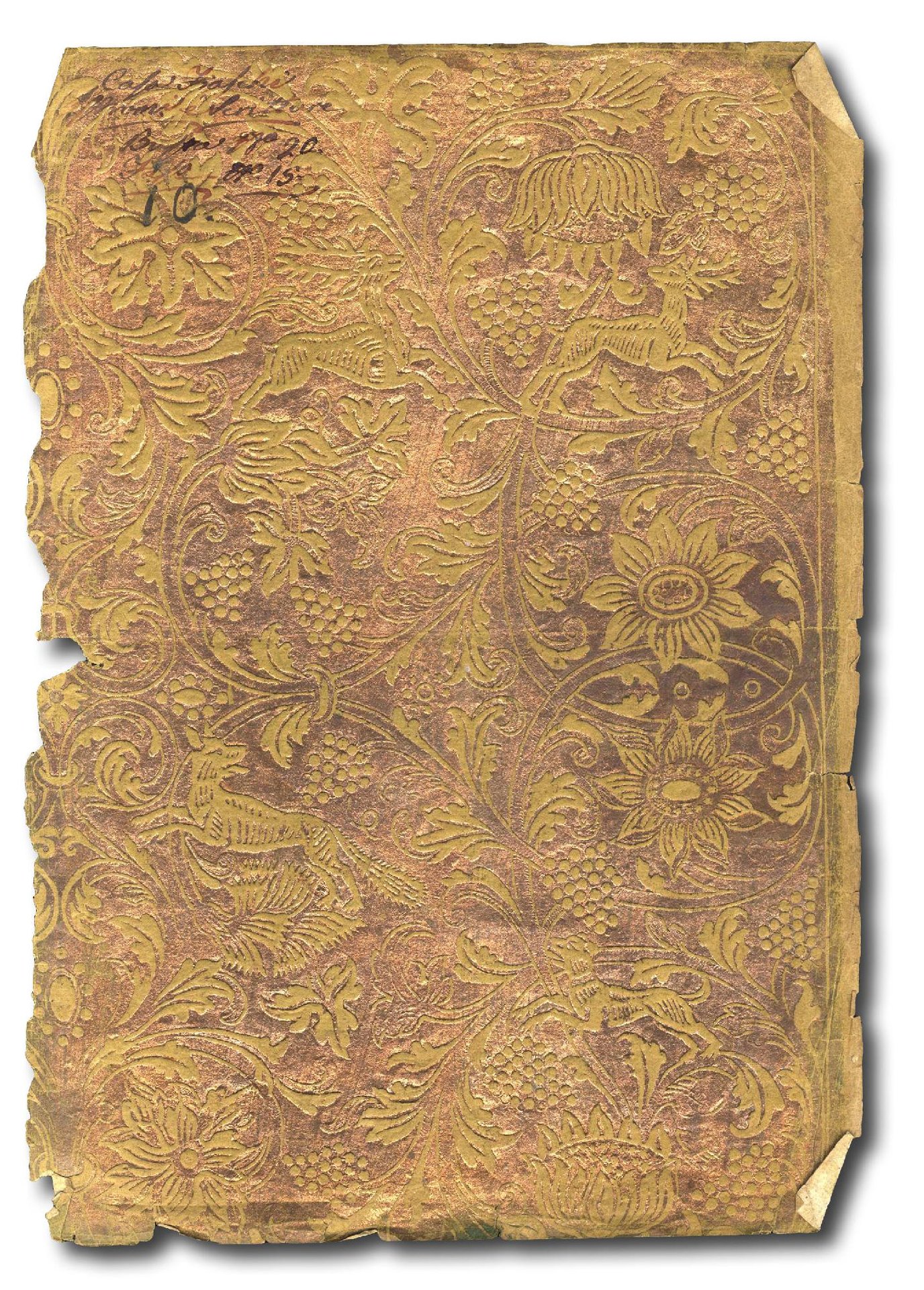 >2 fogli (mm 288x200) con alternanza di superfici dorate incavate e superfici non dorate rilevate; coloritura a pennello in oro su fondo color bronzo. Straodinario disegno con alternanza di fiori, frutti e motivi di caccia: un cane che insegue una volpe, due cervi in fuga tra ramages con uva e fiori, un cane che insegue una lepre, un cane che insegue un capriolo. Lievi strappetti marginali, antica nota manoscritta in alto a destra in inchiostro "Casa Fiaschi..." su uno dei due fogli.
