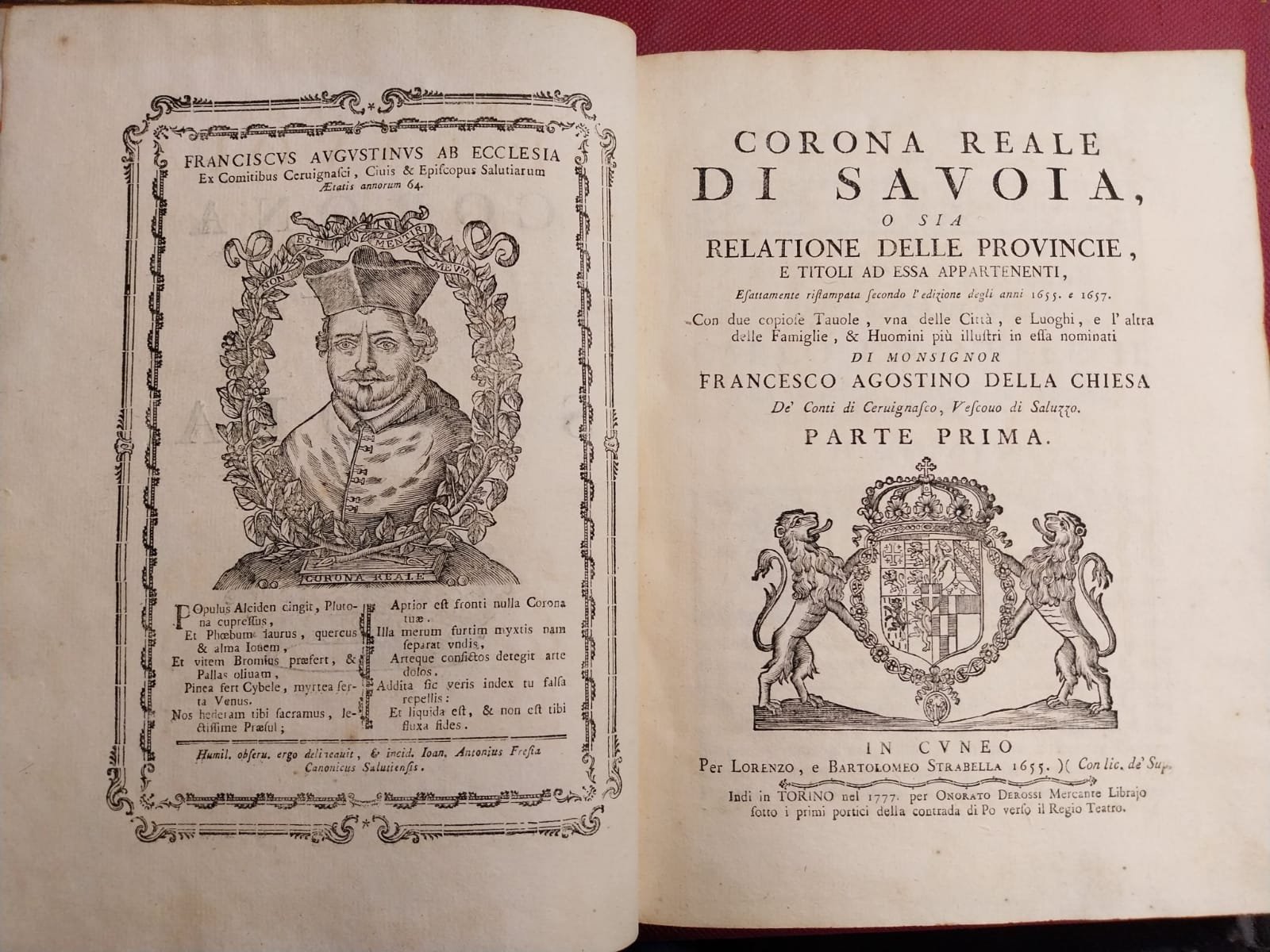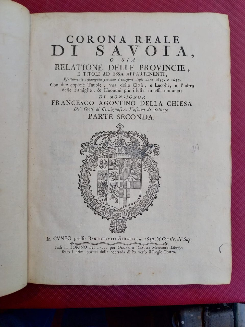 Corona Reale di Savoia, o sia relatione delle provincie, e titoli ad essa appartenenti, esattamente ristampata secondo l'edizione degli anni 1655 e 1657. Con due copiose Tavole, una delle Città, e Luoghi, e l'altra delle Famiglie & Huomini più illustri. Segue con proprio frontespizio: Fiori di Blasoneria per ornare la corona di Savoia con i fregi della nobiltà. Esattamente ristampati secondo l'edizione del 1655.