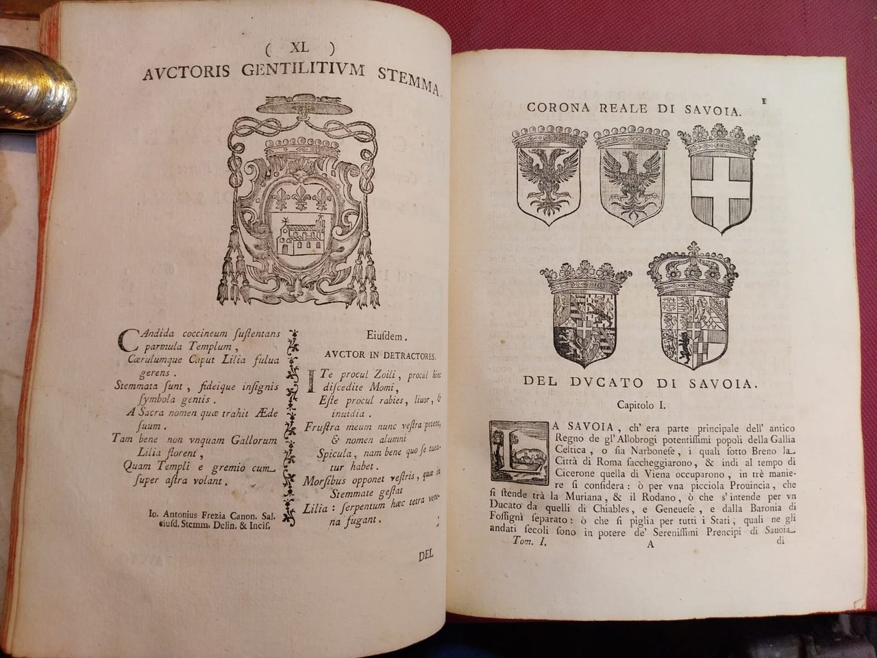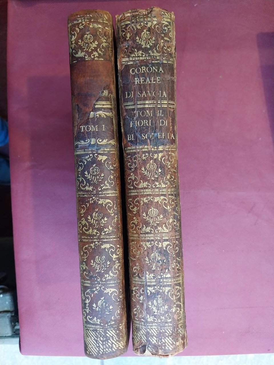 Due voll. in-4°, pp. XL, 286, (2); XVI, 323, (1) per a prima opera e pp. (8), 73, (1), (2) di catalogo per la seconda, legature coeve in piena pelle, dorso liscio, titolo su tassello e ricchi fregi in oro. Tagli rossi. Usure ai piatti, e alle cerniere, tassello del primo volume recante il titolo risulta mancante. Corona di Savoia ai due occhietti e stemmi coronati sabaudi in xilografia ai due frontespizi. Antiporta xilografica al primo vol. con ritratto dell'autore (altro ritratto xilografico del Della Chiesa inciso a m. pag. alla p. 7 del secondo vol.). Numerose stemmi sabaudi incisi su legno n.t. Testatine, finalini, capolettera ornati, copiosi indici delle famiglie e delle località nominate nel testo. Buon esemplare fresco. Reimpressione settecentesca di quest'opera di notevole importanza per la storia piemontese dell'epoca, che valse al Della Chiesa l'appellativo di Muratori del Piemonte. L'autore fa una dettagliata descrizione delle città, dei castelli, delle abbazie, dei monasteri, delle chiese, delle fortificazioni comprese nei domini sabaudi, della loro geografia ed economia e degli uomini illustri che le hanno fregiate nei più diversi àmbiti, indugiando sul Ducato di Savoia, su Chiables, Aosta, il Genovese, il Monferrato, il Marchesato di Saluzzo, il Contado di Romont, Nizza, Asti, Tenda, la Baronia di Vaus, Fossigny, la Signoria di Vercelli, Ceva, Oneglia, Maro, il Regno di Cipro. Unito con proprio frontespizio l'opera: Fiori di Blasoneria, ritratto dell'autore in antiporta inciso su legno da Antonio Fresia da Saluzzo, stemma sabaudo con leoni rampanti al frontespizio. Bella riedizione settecentesca di quest'opera, apparsa originariamente a Torino nel 1655, a ideale complemento della Corona Reale di Savoia,tra i primi lavori storici sull'antica nobiltà sabauda. Manno, I, 1026. Vinciana, 979 Spreti: 'Opera importante per l'araldica sia per le notizie sia per le incisioni delle principali famiglie piemontesi'. 'Saggio di bibl. araldica', p. 43.