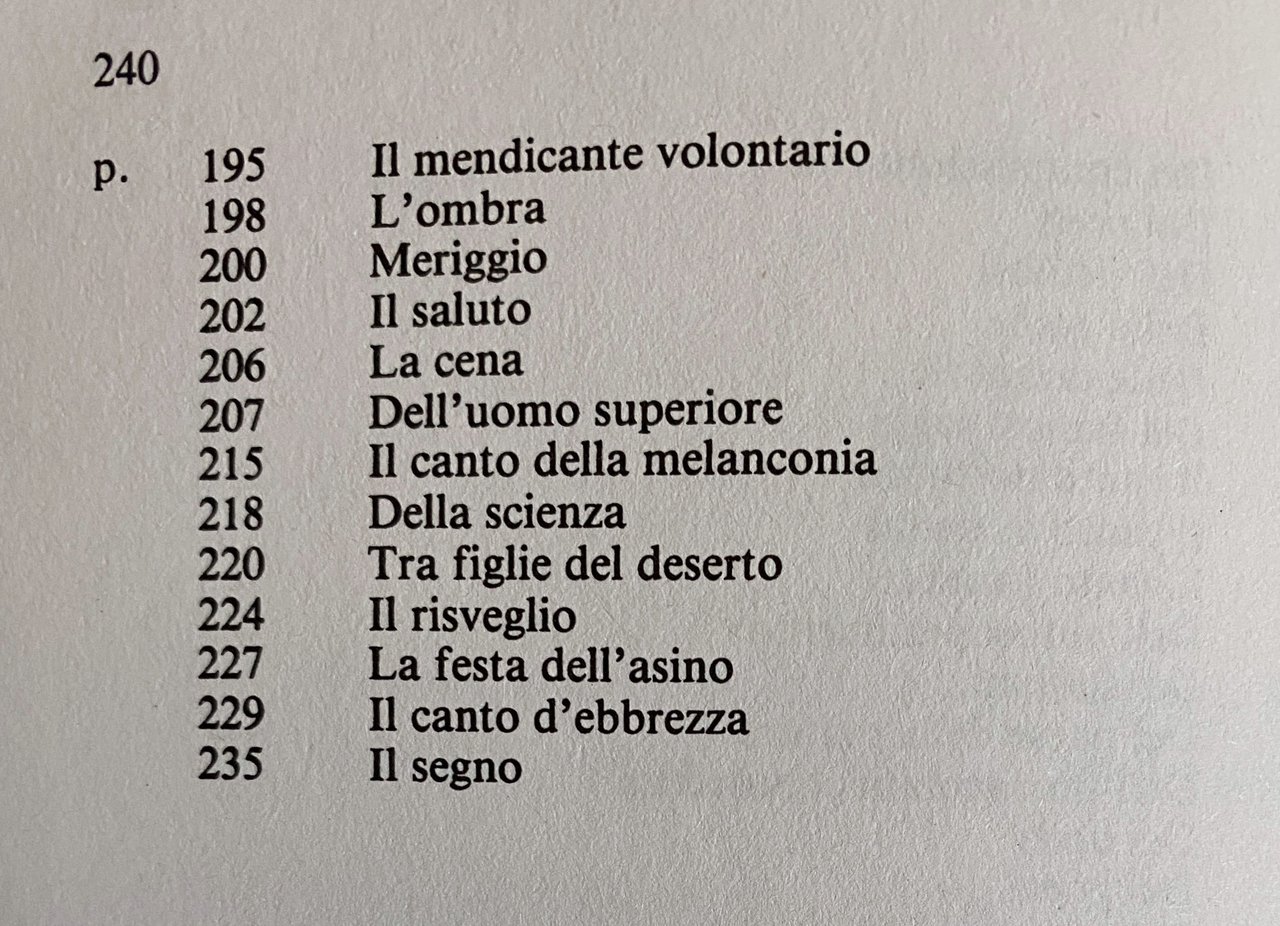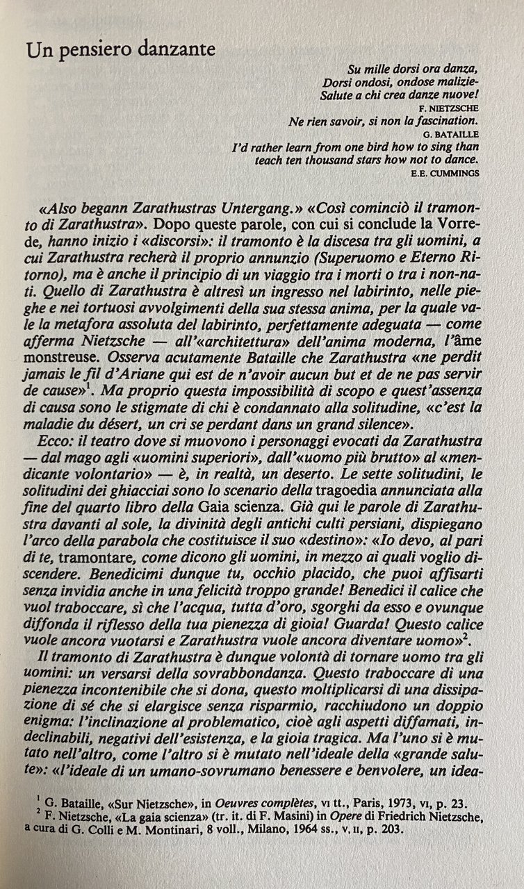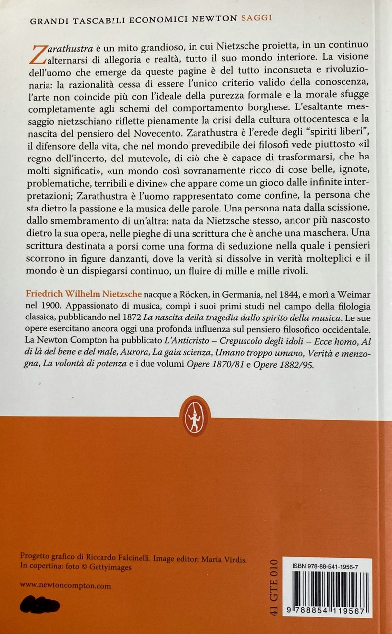 Soggetti: Filosofia tedesca Aforismi Musica Filologia classica Nascita Tragedia Spirito Opere Pensiero filosofico Anticristo Crepuscolo degli idoli Ecce homo Al di là del bene e del male Aurora Gaia scienza Umano troppo Verità Menzogna Volontà di potenza Religione Danzante Also begann Zarathustras Untergang Tramonto Vorrede Discorsi Uomini Superuomo Eterno Ritorno Viaggio Morti Anima Labirinto Ame monstreuse Bataille Sette solitudini Sole Divinità Culti persiani Destino Gioia Uomo Giorgio Colli Mazzino Montinari Divino Danza Jean-Michel Rey Signes Lecture Rohde Gesammelte Briefe Frammenti postumi Metamorfosi Virtù Morale Mercato Arthur Schopenhauer Montagna Cristianesimo Giudaismo Richard Wagner Ralph Waldo Emerson Rapallo Köselitz Peter Gast Incipit Tragoediae Parabole Dio Aforisma 125 Pedagogia Zoroastrismo Avestā Valori Profeta Dottrina Decadenza Cultura occidentale cristiana socratica Metafisica Platonismo Prologo Scimmie Übermensch Nichilista Nichilismo Uguale Volontà di potenza Pietà Identico Zoroastro Folla Benessere Gregge Risata Vita Anello Trasvalutazione Autosuperamento Creatività Amore Esistenza Capacità Coraggio Cammello Leone Fanciullo Umiltà Obbedienza Adattamento Libertà Autodeterminazione Innocenza Gioco Saggio Transmondani Hinterweltlern Mondo Dolore Corpo Passioni Legge Giudici Leggere Scrivere Sangue Follia Albero Solitudine Parabola Predicatori Guerra Nemico Idolo Stato Mosche Castità Amico Cammino Popolo Vecchie Giovani Mantello Donna Vipera Figli Matrimonio Specchio Isole Fichi Preti Virtuosi Plebe Tarantole Uguaglianza Saggi illustri Oltremondo Canto Notte Funebre Sublimi Poeti Viandante Pasquale Almirante Giammetta Basilea Joachim Köhler Paul Rée Lou Andreas Salomé Elisabeth Forster Carlo Sini Compassione Indovino Naumburg Lipsia Romanzo Zadig Voltaire Junk Kierkegaard Bambino Bestie Desiderio Disprezzo Dostoevskij Felicità Genealogia Hegel Heidegger Lussuria Montagne Platone Plebaglia PRidere Riso Saggezza Sofferenza Vivere Thus Spoke Book for Everyone Nobody Monte Olivi Bibbia Lutero Gathas Hymns Buddismo Zittel Naumann Adrian Del Caro Robert Pippin Kaufmann RJ Hollingdale Clancy Martin Alexander Tille Deutscher Taschenbuch Verlag Goethe German Philosophy Aphorisms Music Classical Philology Birth Tragedy Spirit Works Philosophical Thought Antichrist Twilight of the Idols Beyond Good and Evil Dawn Science Too Human Truth Lie Will to Power Religion Dancing Sunset Speeches Men Superman Eternal Return Journey Dead Soul Labyrinth Solitude Sun Divinity Persian Cults Destiny Joy Divine Man Dance Posthumous Fragments Metamorphosis Virtue Market Mountain Christianity Judaism Parables God Aphorism Pedagogy Zoroastrianism Values Prophet Doctrine Decadence Western Christian Culture Socratic Metaphysics Platonism Prologue Monkeys Nihilist Nihilism Equal Will Piety Identical Zoroaster Crowd Well-being Flock Laughter Life Ring Transvaluation Self-overcoming Creativity Love Existence Ability Courage Camel Lion Humility Obedience Adaptation Freedom Self-determination Innocence Game Essay Transmundane World Pain Body Passions Law Judges Reading Writing Blood Madness Tree Parable Preachers War Enemy Idol State Flies Chastity Friend Path People Old Young Cloak Woman Viper Children Marriage Mirror Priests Virtuous Tarantulas Equality Illustrious Sages Song Funeral Night Sublime Poets Wanderer Basel Compassion Soothsayer Leipzig Novel Beasts Desire Contempt Happiness Genealogy Lust Mountains Plato Rabble Laugh Wisdom Suffering Living Mount Olives Bible Luther Buddhism