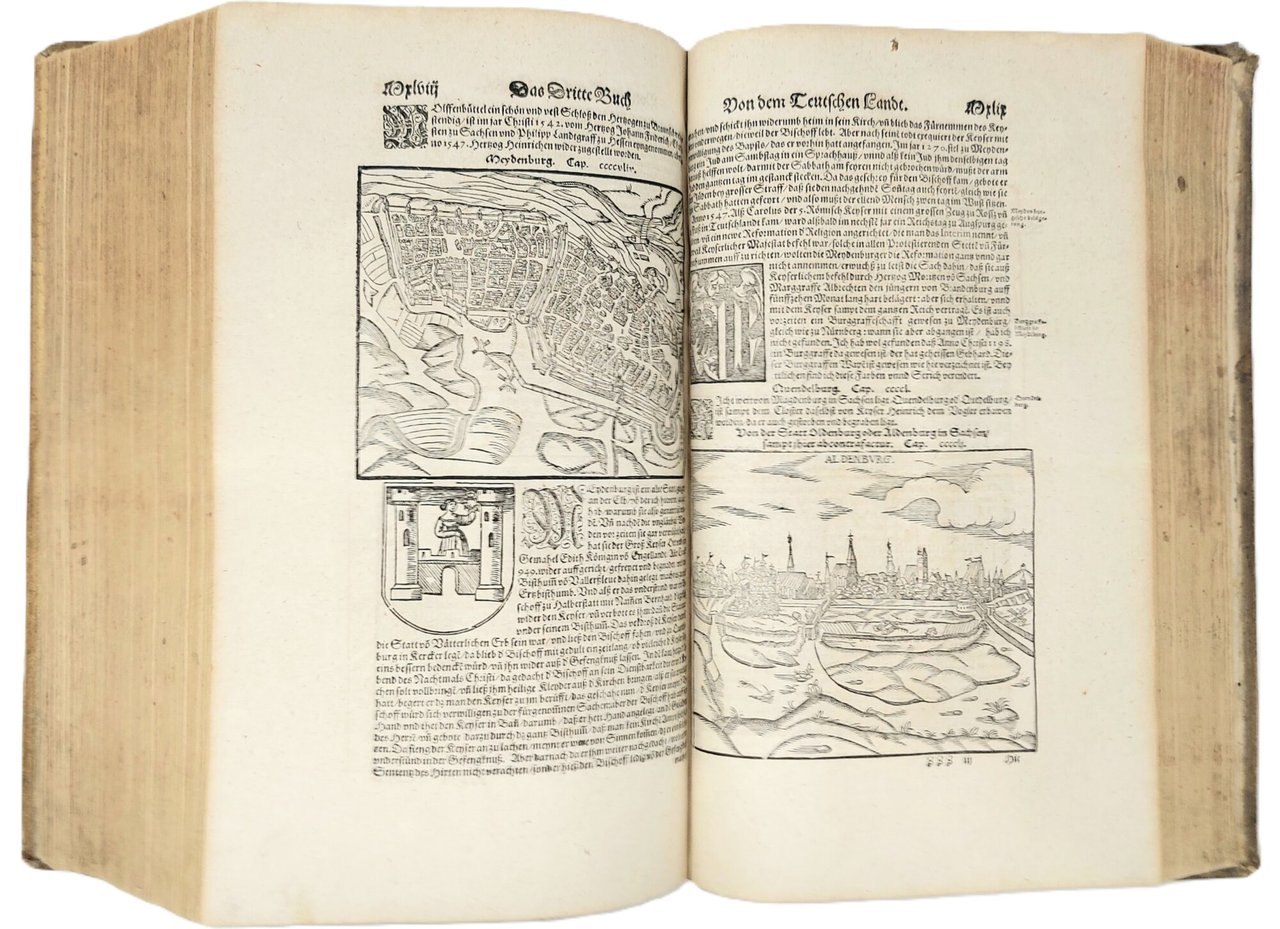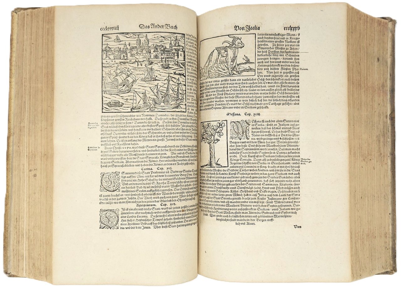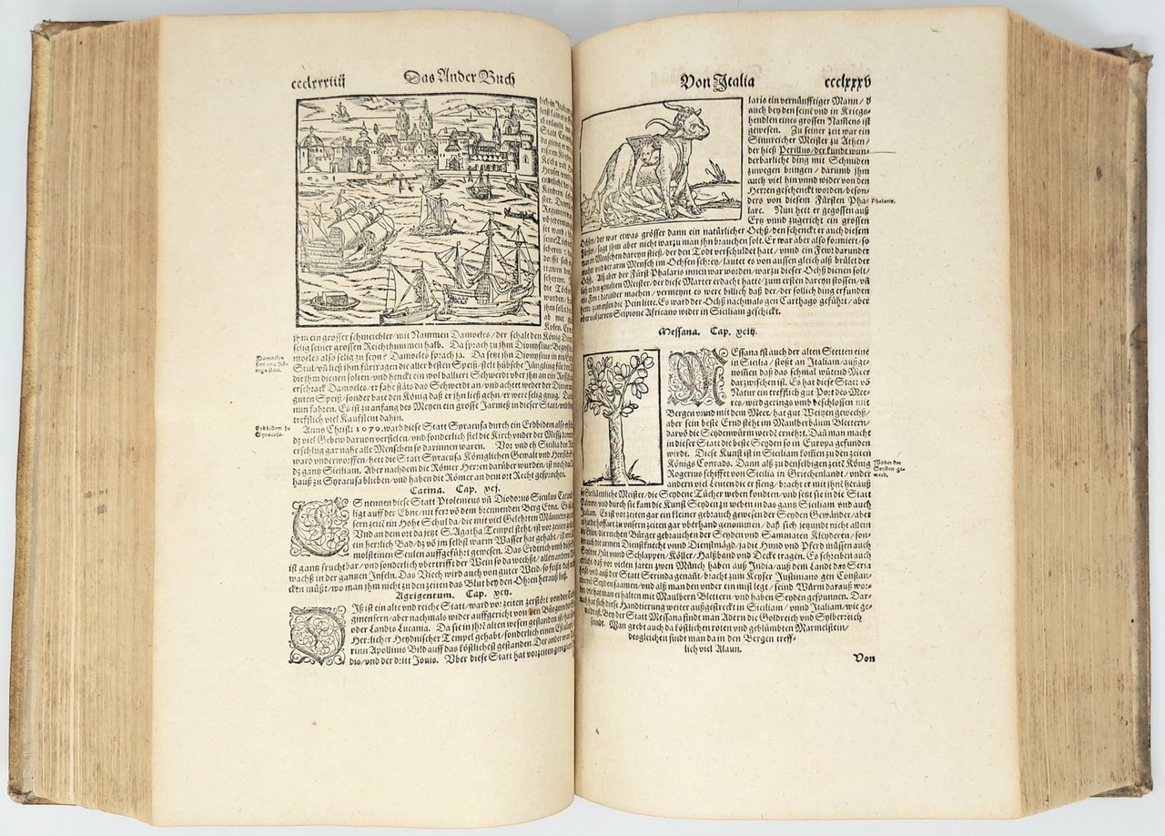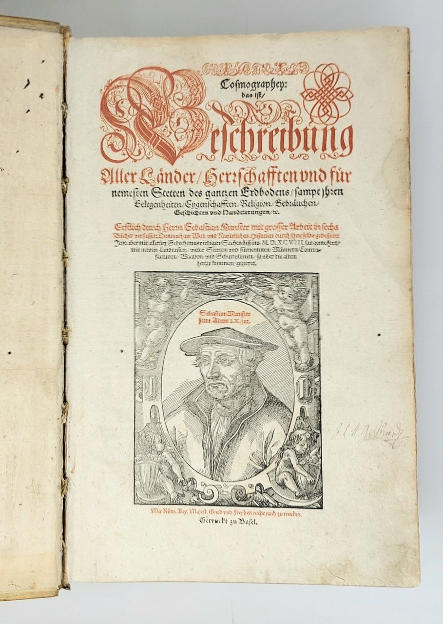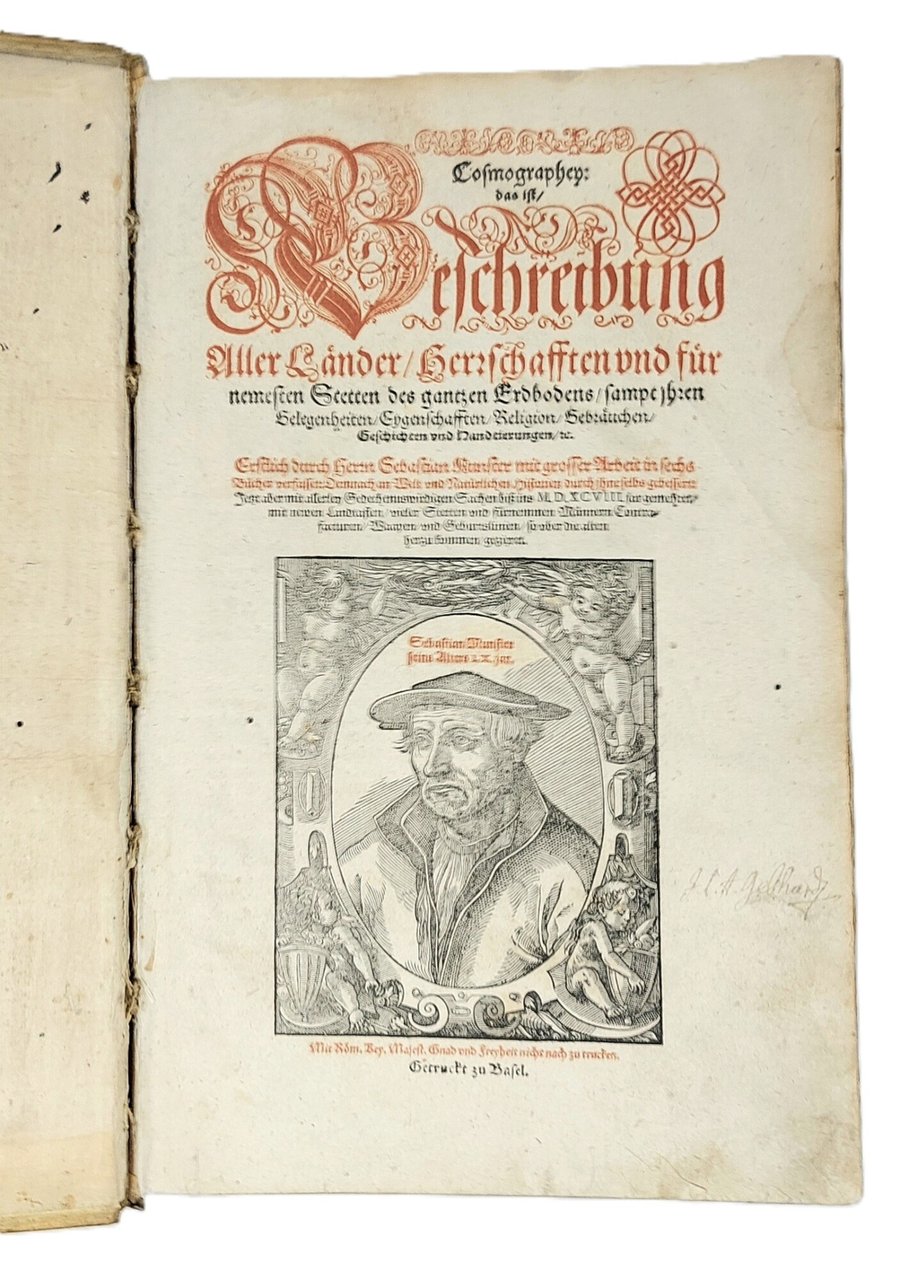 >in-folio (370x250 mm.), pp. (28), 1462, legatura tedesca coeva in pelle di scrofa, piatti interamente decorati a secco da triplice ordine di bordure, fleuron al centro dei piatti, dorso a sei nervi. Titolo inciso in rosso e nero in caratteri gotici con ritratto dell'autore in silografia; testate, grandi capilettera gotici, impresa tipografica in fine. Illustrato da 26 carte geografiche su doppia pagina, inclusi 2 mappamondi (Planisfero moderno e tolemaico, Shirley 162 e 163), 67 tavole di vedute e piante di città su doppia pagina, molte delle quali entro bordura ornamentale, 2 carte ripiegate f.t. con il panorama di Heidelberg e Vienna, approssimativamente 1250 silografie n.t. Pubblicata in tedesco nel 1544 ed in latino l'anno successivo, l'opera raggiunse in breve un enorme successo editoriale, grazie alla ricchezza delle illustrazioni ed alle numerose carte geografiche che l'arricchiscono. Le silografie che la illustrano nel testo raffigurano vedute e piante topogr. di varie nazioni, battaglie, ritratti, usi e costumi dei vari popoli. Alcune vedute sono arricchite da particolari curiosi. Edizione aggiornata ed aumentata; le carte relative al nuovo mondo risultano in quest'edizione, assai più dettagliate rispetto alle edizioni degli anni 1544-1578. Bell'esemplare genuino a grandi margini, lievissima uniforme ingiallitura, rari aloni in qualche margine. Sabin 51395. Alden and Landis 598/73. Burmeister 83.