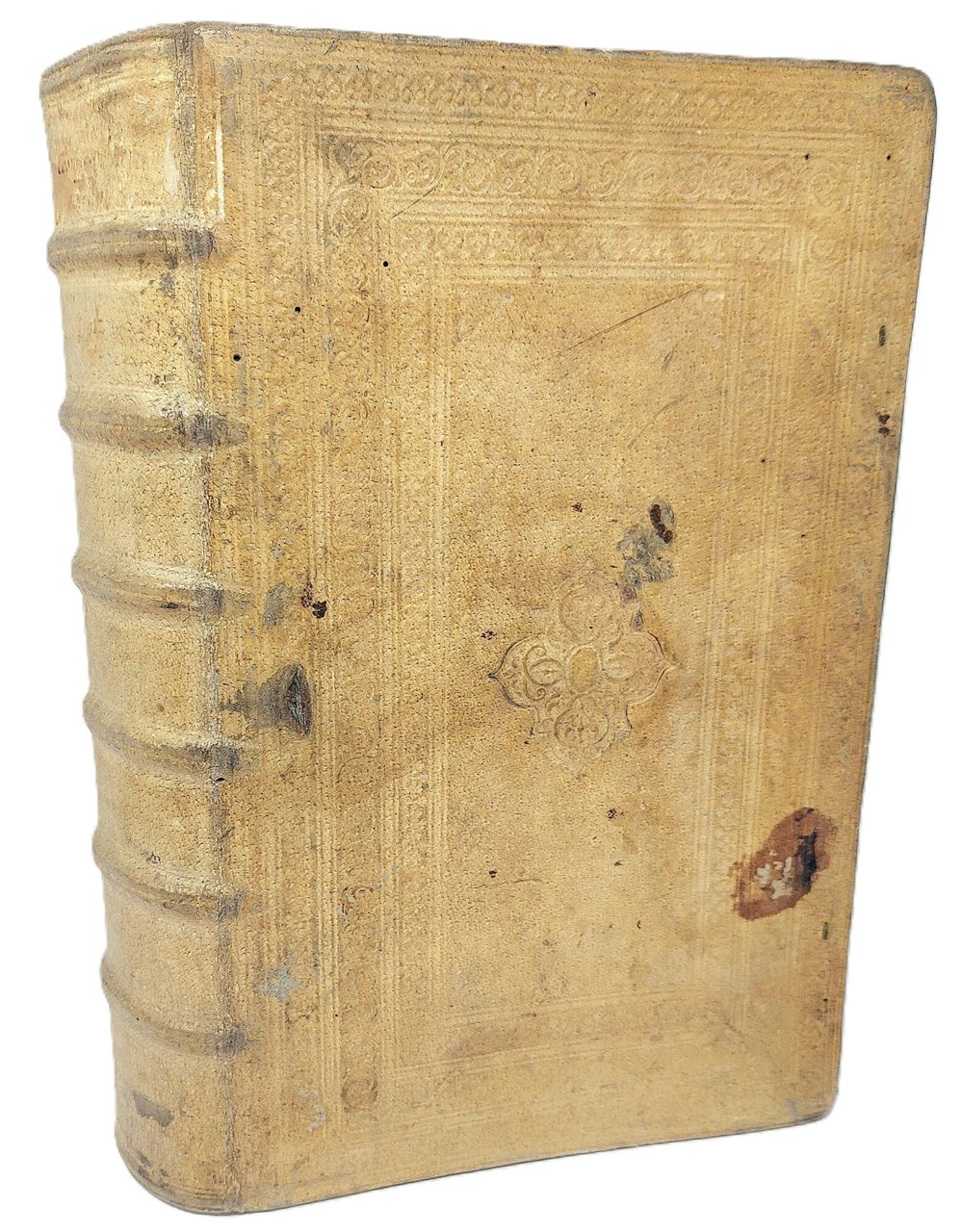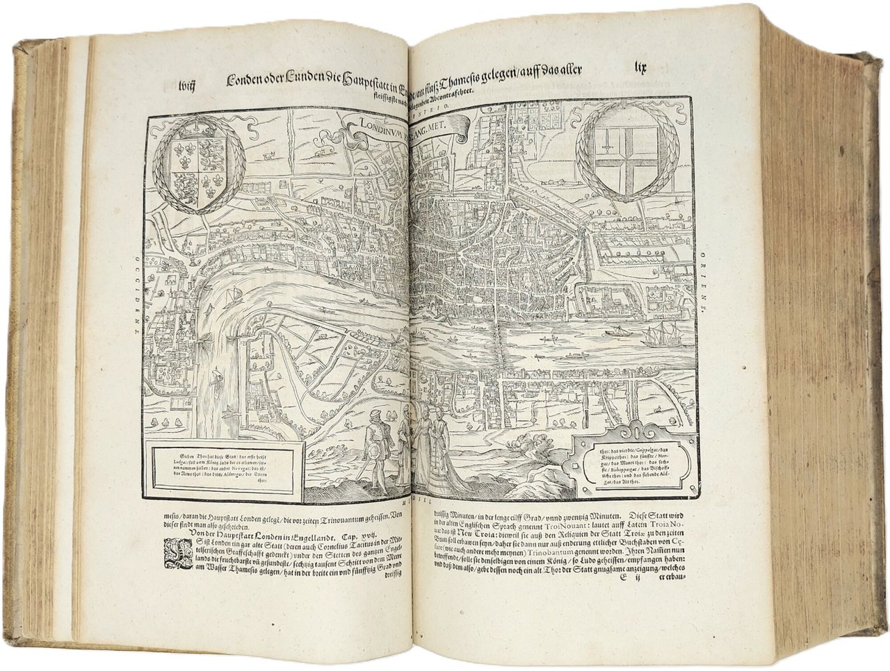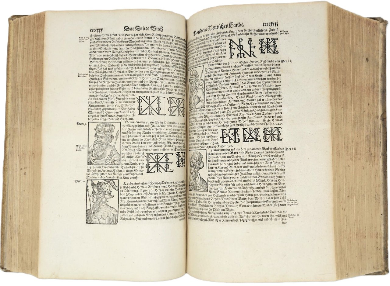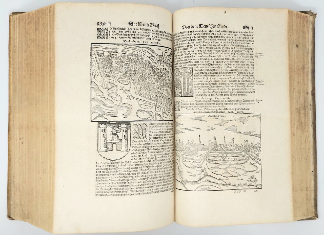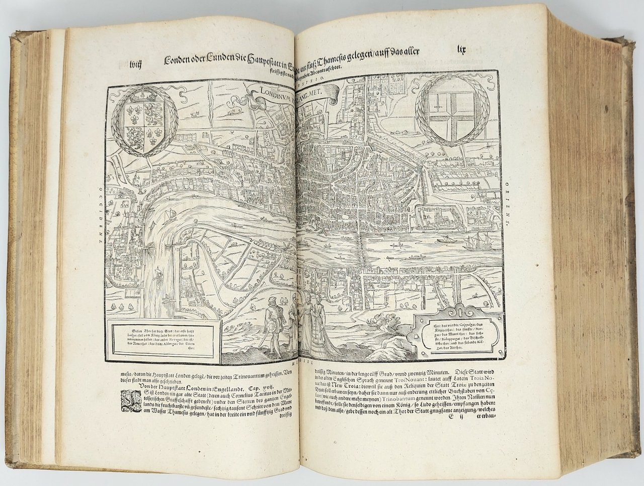 >in-folio (370x250 mm.), pp. (28), 1462, legatura tedesca coeva in pelle di scrofa, piatti interamente decorati a secco da triplice ordine di bordure, fleuron al centro dei piatti, dorso a sei nervi. Titolo inciso in rosso e nero in caratteri gotici con ritratto dell'autore in silografia; testate, grandi capilettera gotici, impresa tipografica in fine. Illustrato da 26 carte geografiche su doppia pagina, inclusi 2 mappamondi (Planisfero moderno e tolemaico, Shirley 162 e 163), 67 tavole di vedute e piante di città su doppia pagina, molte delle quali entro bordura ornamentale, 2 carte ripiegate f.t. con il panorama di Heidelberg e Vienna, approssimativamente 1250 silografie n.t. Pubblicata in tedesco nel 1544 ed in latino l'anno successivo, l'opera raggiunse in breve un enorme successo editoriale, grazie alla ricchezza delle illustrazioni ed alle numerose carte geografiche che l'arricchiscono. Le silografie che la illustrano nel testo raffigurano vedute e piante topogr. di varie nazioni, battaglie, ritratti, usi e costumi dei vari popoli. Alcune vedute sono arricchite da particolari curiosi. Edizione aggiornata ed aumentata; le carte relative al nuovo mondo risultano in quest'edizione, assai più dettagliate rispetto alle edizioni degli anni 1544-1578. Bell'esemplare genuino a grandi margini, lievissima uniforme ingiallitura, rari aloni in qualche margine. Sabin 51395. Alden and Landis 598/73. Burmeister 83.