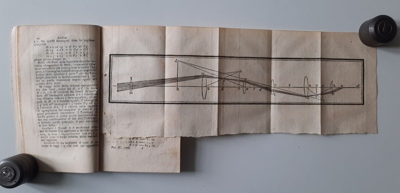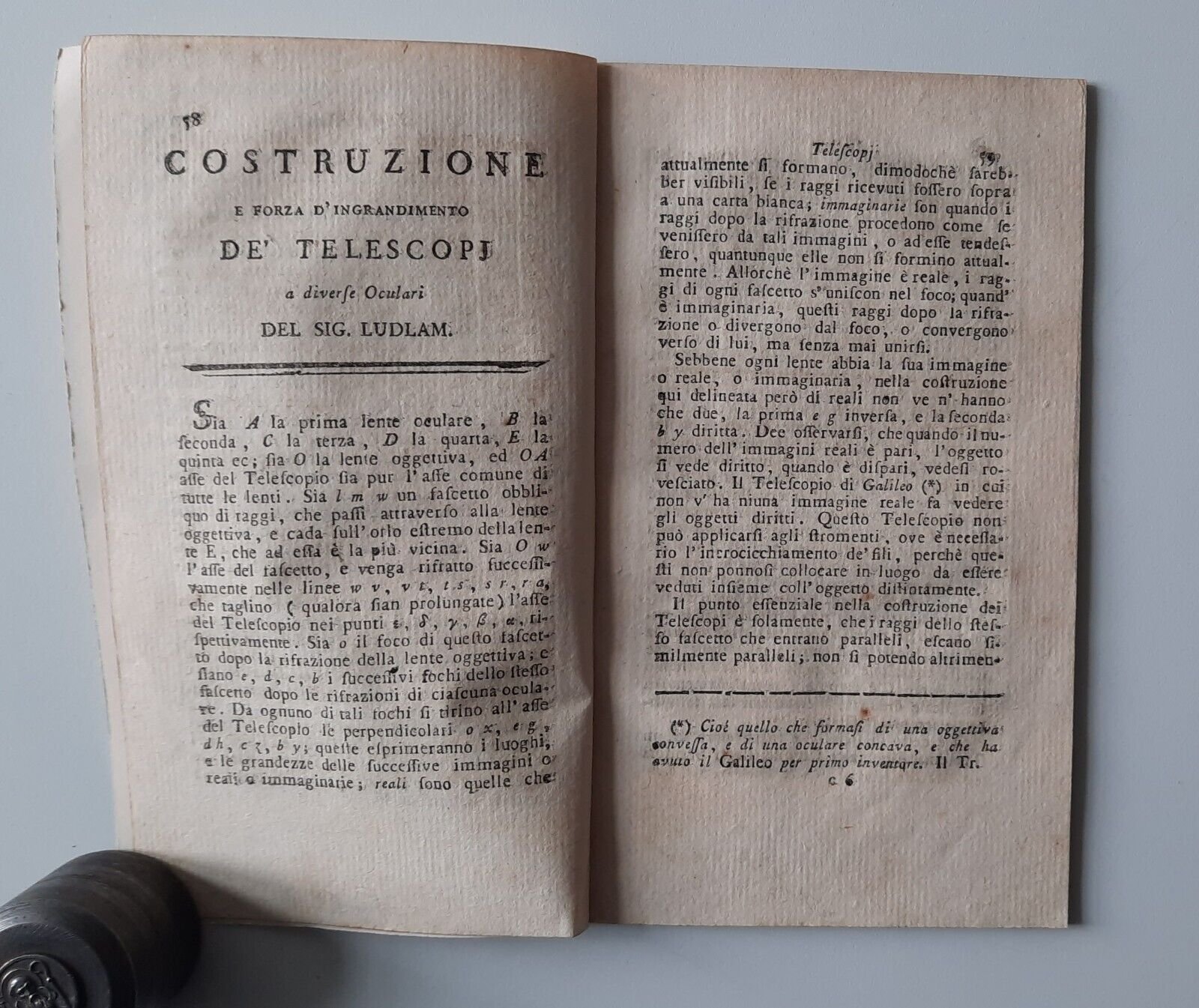COSTRUZIONE E FORZA D'INGRANDIMENTO DE' TELESCOPI A DIVERSE OCULARI DEL SIG. LUDLAM ESTRATTO FINE '700In 12, pag. 37, legatura contemporanea, copertina muta in cartoncino, tavola ripiegata.Estratto da miscellanea.In ottime condizioni.