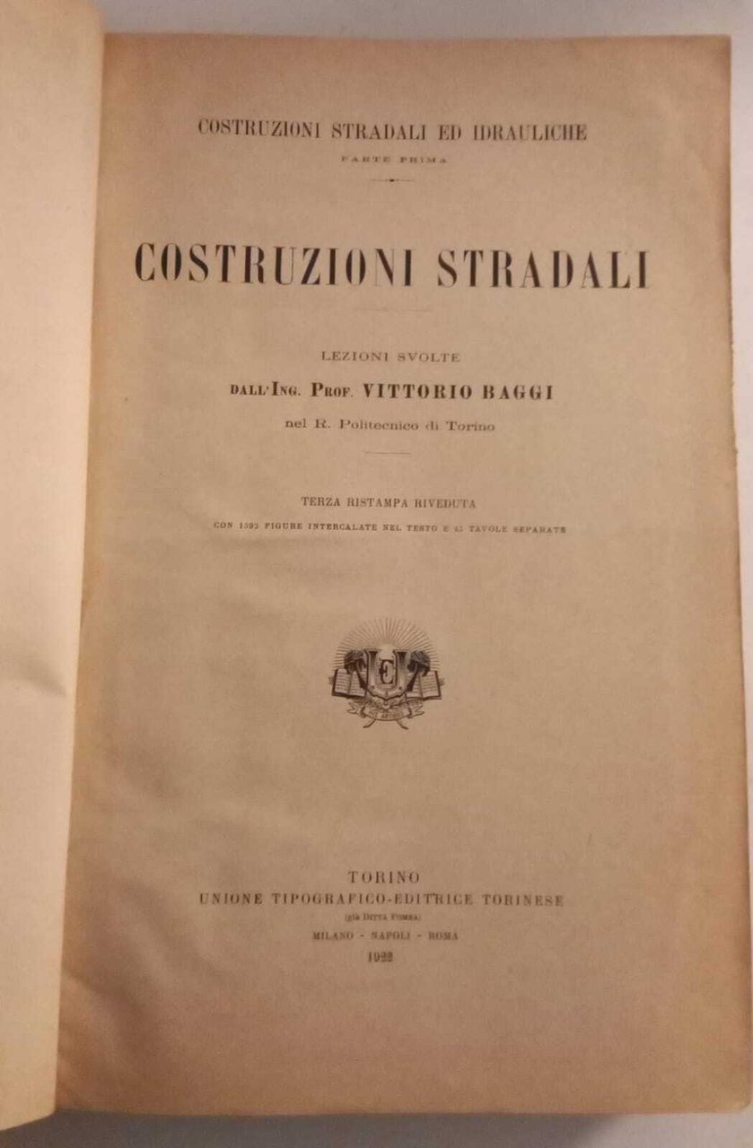 Costruzioni stradali. Lezioni svolte dall'Ing. Prof. Vittorio Baggi nel R. Politecnico di Torino. Terza ristampa riveduta, con 1593 figure intercalate e 45 tavole separate. La copertina editoriale è stata sostituita da una artigianale rigida con usuali segni del tempo, le pagine lievemente stanche agli angoli e brunite ai bordi ma in buono stato. 603 Buono (Good) .