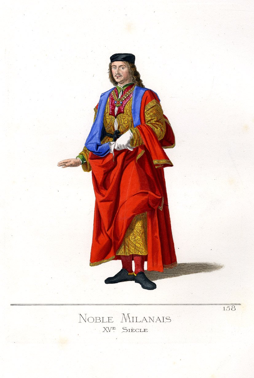 >3 vol. in-4, pp. (4), XXIV, 132; (4), 152; (4), 132; leg. m. marocchino e ang., tit. oro e fregi al dorso a nervi, taglio super. dor. Corredati di 200 magnifiche tavole num. f.t. (la tav. 190 è anteposta alla 189), disegnate nei minimi particolari, magistralmente incise in rame dal Mercuri e vivacemente colorate a mano all'epoca. Interessante documentazione iconografica riguardante il costume storico medievale, raffigurato in tutti i suoi aspetti (nobiltà, magistratura, militare, popolare). Paolo Mercuri (Roma, 1804 - Bucarest, 1884) fu stimato incisore a bulino e pittore di ritratti, studiò all'Accademia di San Luca a Roma, insegnò alla scuola francese della sua città, visse a lungo a Parigi ed ivi espose al Salon a partire dal 1847. Bell'esempl. su carta forte, a grandi margini (con lievi ingialliture qua e là; le legature deboli alle cerniere). Benezit IX, 502. Colas 129. Lipperheide 335.