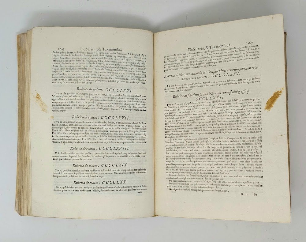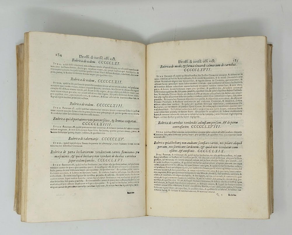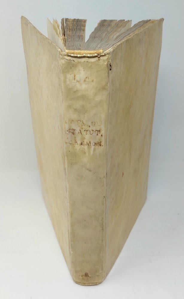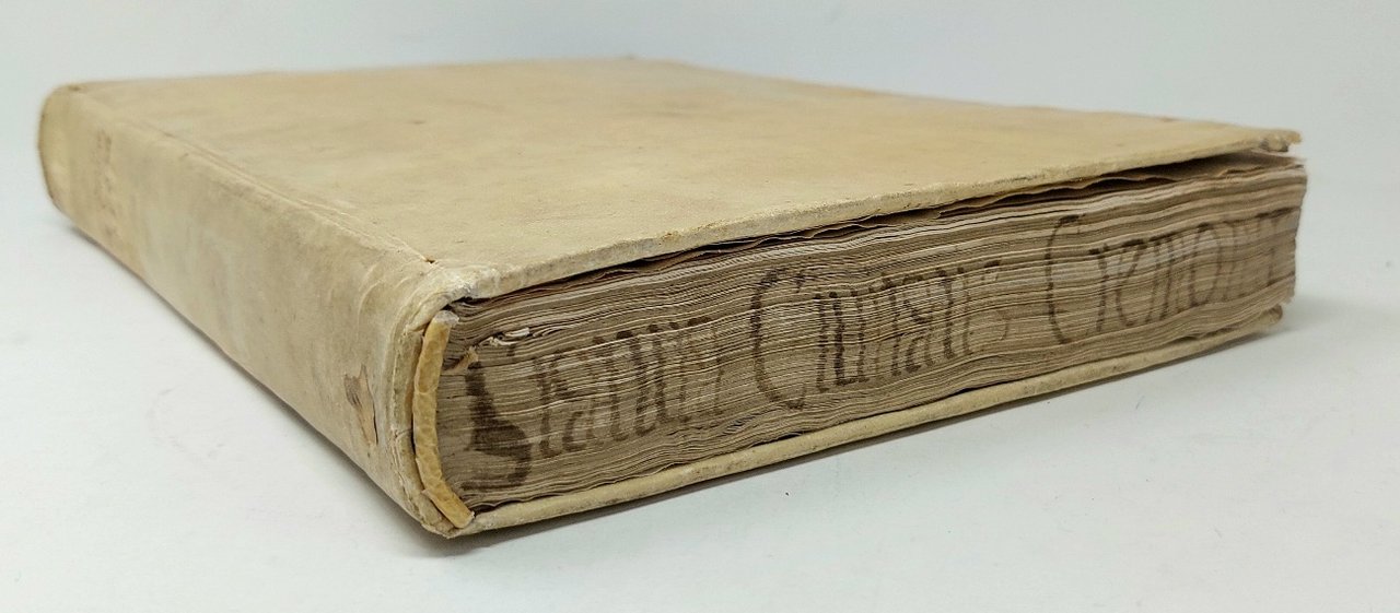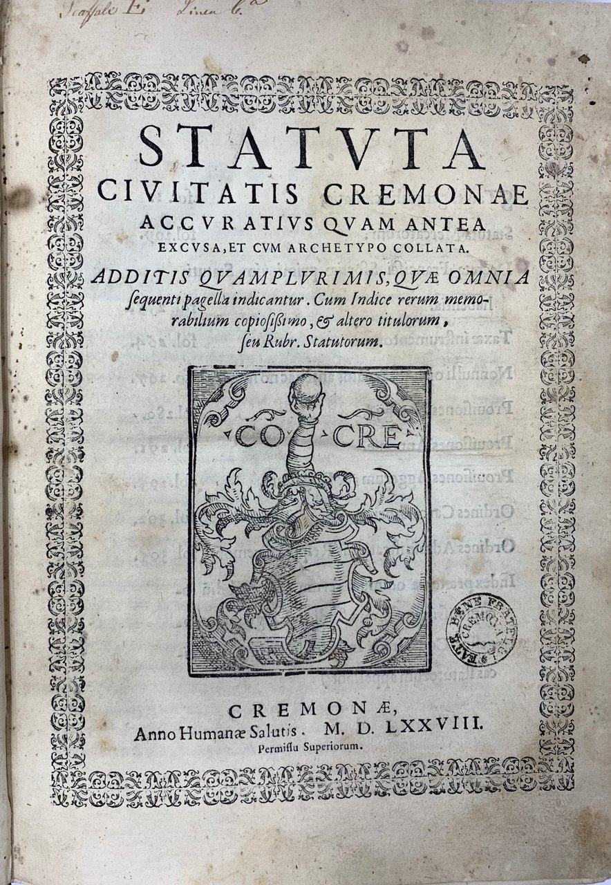 >2 opere in un vol. in-folio (285x200 mm), pp. (10), 312 (l'ult. b.), (56, Index seu Rubrica Statutorum). Tit. racchiuso in bordura silogr., stemma della città al centro della stessa pagina, iniz. silogr., marca tipogr. in fine, car. rom. per il testo e corsivo per i tit. delle rubriche. Legatura in piena pergamena rigida, titolo manoscritto al dorso e sul taglio inferiore. Gli Statuti, compilati nel 1387-88 ed entrati in vigore nel 1390, sono riuniti per materia in dieci gruppi: Statuta generalia (la parte preponderante del vol., in 651 rubriche, fino a pag. 208); seguono Statuta Mercatorum, Decreta Franc, Sfortiae, Taxae instrumentorum, Nonnulli ordines Senatus, Provisiones Navigij, Prov. annonae, Prov. aggerum et Dugalium, Ordines carceratorum, Ordini del governo della città di Cremona. Seconda edizione con alcune aggiunte (dopo la prima del 1485) dell'antico testo, di fondamentale importanza e assai rara. Buon esemplare, fresco (ma pochi aloni d'umido ai primi fogli e qualche sporadica arrossatura), al frontespizio timbro di biblioteca estinta e nota manoscritta di antica collocazione al margine superiore. (Segue:) Ordines excellentiss. Senatus Mediolani, editi circa eiusdem decreta fienda in ciuilibus causis, et criminalibus, nec non de ijs quae per iudices huius dominij in memoratis causis servari debent, pp. (8), al frontespizio xilografia dello stemma araldico di Filippo II di Spagna usato in Milano. Rarissima raccolta di pronunce senatorie, in perfetto stato. I) Manca a Bologna, Cinquecentine Trivulziana. Cat. Senato II, 313-4. Manzoni II, 155. Fontana I, 412. STC. 203. Adams C-2927. -