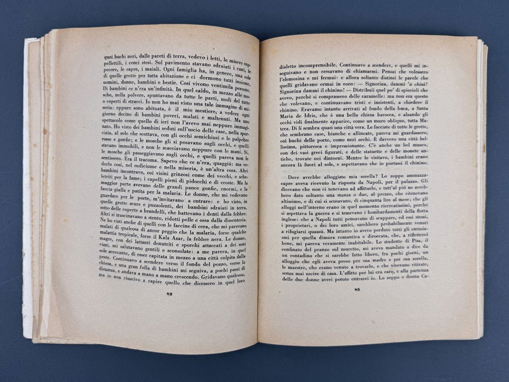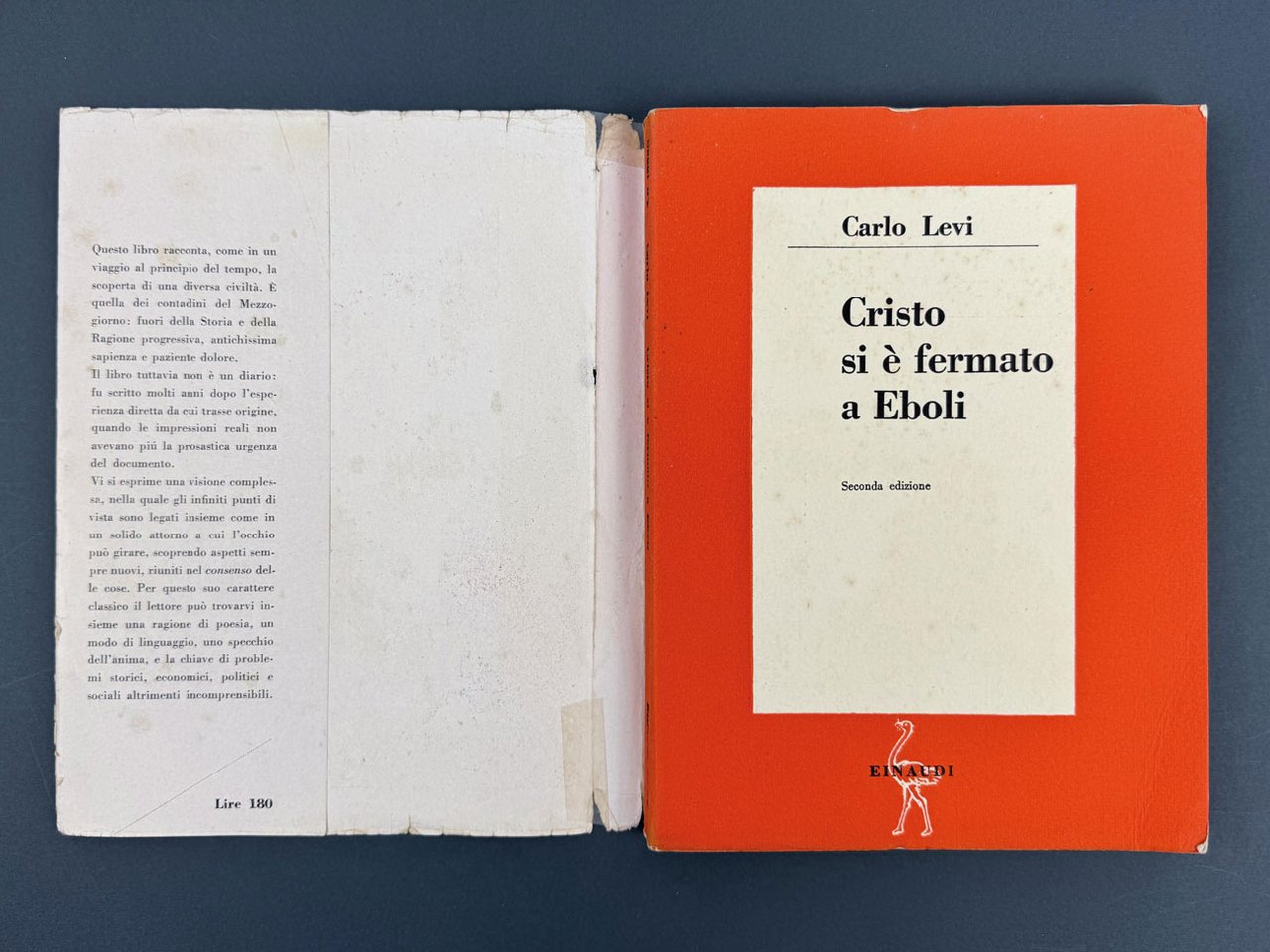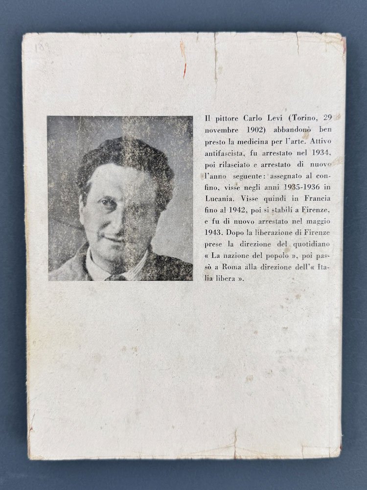LIBROPrima edizione, seconda tiratura («seconda edizione»).Esemplare in condizioni più che buone se non ottime (sovracoperta con tracce d’usura, piccole mancanze alla testa e al piede del dorso e piccole lacerazioni non deturpanti al piatto posteriore. Carte occasionalmente fiorite e tagli leggermente bruniti).Seconda stampa del 20 aprile 1946, segue la prima tiratura del settembre 1945 e fu la prima di una lunga serie di ristampe e poi edizioni. Non comune completa della sovracoperta e in buone condizioni. -- Torinese gobettiano, da sempre indaffarato nella sotterranea attività antifascista in collegamento con gli esuli di GeL a Parigi, nel 1935 Carlo Levi fu arrestato e mandato al confino ad Aliano, in provincia di Matera, dove rimase otto mesi, beneficiando del rilascio successivo ai provvedimenti di clemenza adottati dal regime in seguito al buon esito della campagna nordafricana. Come è noto, «nella sua opera capitale» Levi «liberamente rielabora, interiorizzandola, l’esperienza del confino», rivelando «una singolarissima capacità di ibridazione dei codici che governano i generi letterari ai quali è più o meno strettamente apparentabile (romanzo, saggio, prosa d'arte, mémoire, “cosa vista”, corrispondenza di viaggio)» (Contorbia & Picciau, voce DBI, vol. 64, 2005). Da subito accompagnata da un grande successo di critica e pubblico, capolavoro di Carlo Levi si è imposto come classico moderno, un libro d’eccezione che viene insegnato nelle scuole e su cui gli studiosi continuano a interrogarsi.