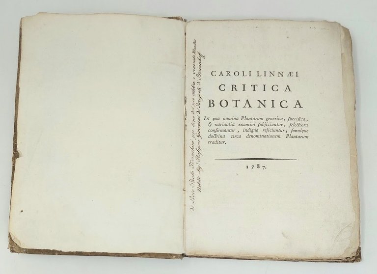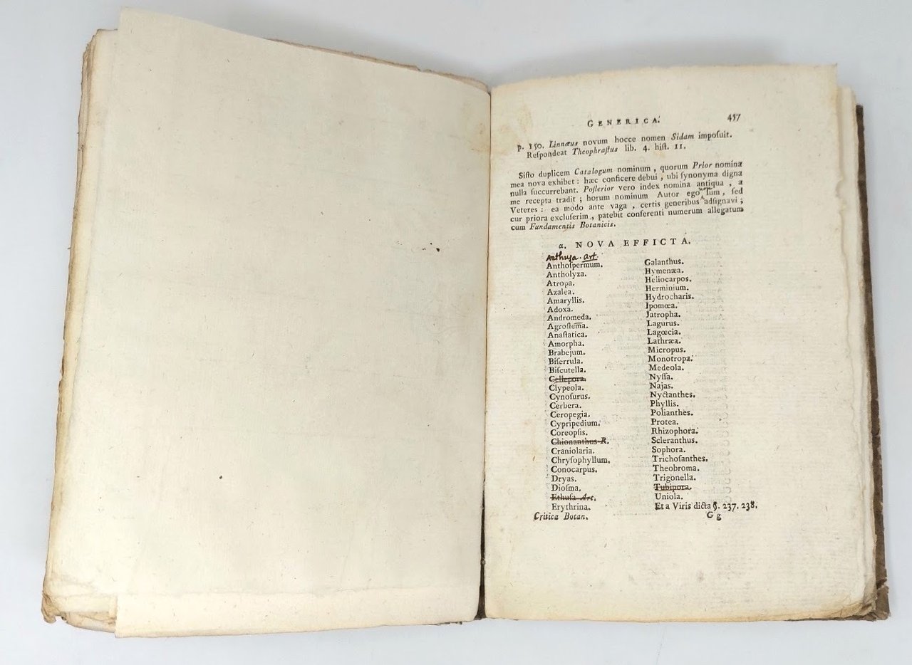 >in-8, pp. (2), 231 (num. 363-594), legatura cart. epoca, tit. ms. al dorso. Il titolo e la data si ricavano dall'occhietto, cui seguono la dedica di Linneo al Principe Jo. Jac. Dillen e l'avviso al lettore, ambedue datati ''ex Musaeo Cliffortiano 1737''. Trattasi di parte del VII ed ultimo volume della ristampa delle opere di Linneo ''Systema Plantarum Europae'', curata da Gilibert e pubblicata a a Ginevra dal 1785 al 1787 (vedi Sandbergs Bokhandel, Cat. of Works of Linnaeus, 1957, n. 39, note, e n. 143). Esempl. di studio, con varie correzioni manoscritte, interamente interfoliato con fogli bianchi per eventuali note o aggiunte (v. ad esempio il f. tra le pp. 430-1).
