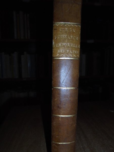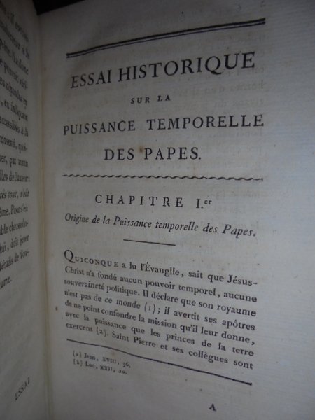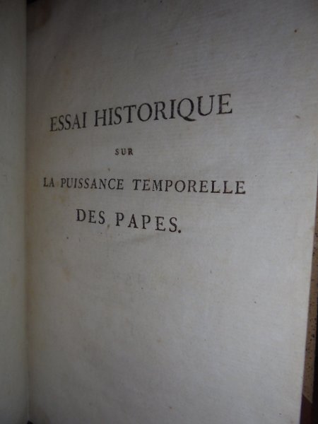 (Critica religiosa) (TURPETIN). Paris, Le Normand, 1810. Essai historique sur la puissance temporelle des papes, sur l' abus qu'ils ont fait de leur ministère spirituel, et sur les guerres qu'ils ont déclarées aux souverains, spécialement à ceux qui avaient la prépondérance en Italie. Ouvrage traduit de l' espagnol. In-8°, m. pelle coeva con angoli. viii, 374 pp. Ottimo esemplare di opera ormai rara. L' autore è probabilmente francese. Ex libris al front. Barbier, II, p. 210. Quérard, La France litéraire, IX, p. 582. Neg. sotto Mass.