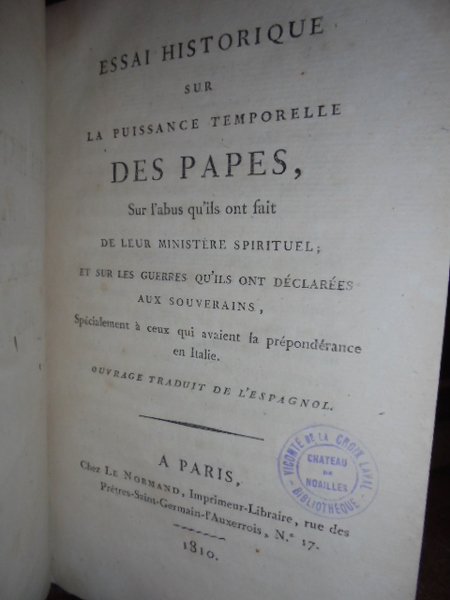 (Critica religiosa) Essai historique sur la puissance temporelle des papes, sur l' abus qu'ils ont fait de leur ministère spirituel, et sur les guerres qu'ils ont déclarées aux souverains, spécialement à ceux qui avaient la prépondérance en Italie. Ouvrage traduit de l' espagnol.
