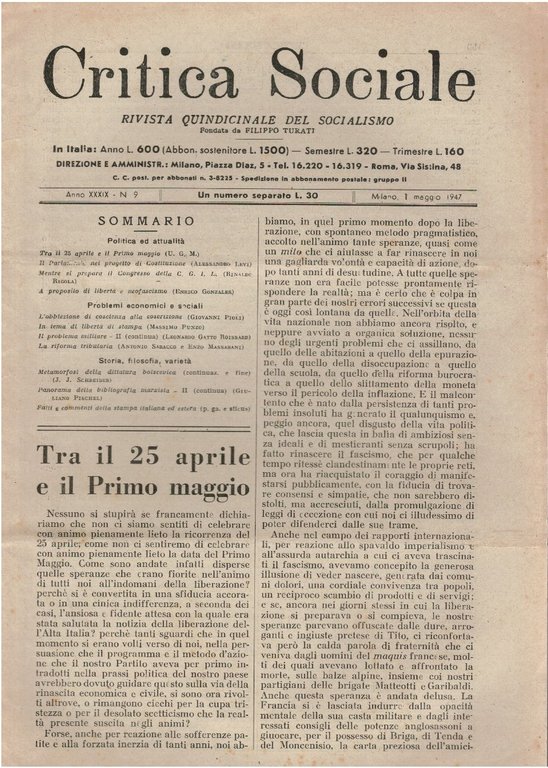 Critica sociale rivista quindicinale del socialismo. Fondata da Filippo Turati