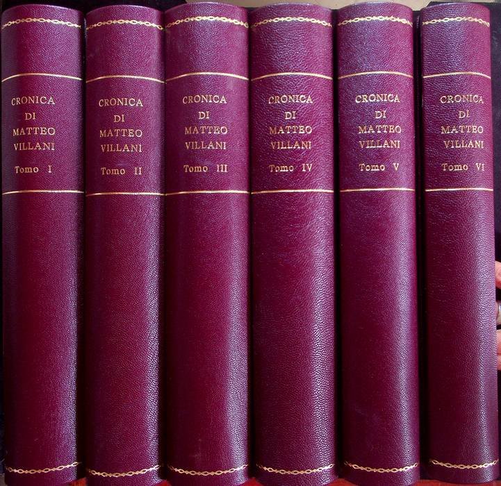 6 v. (XIV, 305, [1] p.; 300 p.; 355, [1] p.; 348 p.; 319, [1] p.; [4], XXIII, [1], 241, [1] p.), 4°(25 cm), piacevole legatura in piena pelle mod. su stile antico con punte, filetti e titoli oro al dorso, piatti marmorizzati, I VOLUMI CONSERVANO LE BROSSURE EDITORIALI ANTERIORE E POSTERIORE. Condizioni : USATO - Stato : Buono. Altre note : Il v. 6 contiene: Le vite d'uomini illustri fiorentini scritte da Filippo Villani colle annotazioni del conte Giammaria Mazzuchelli. IL PREZZO SI RIFERISCE AI 6 VOLUMI INSIEME (opera completa).Cfr. Gamba, 1034: "Per questa ottima ristampa l'editore Ignazio Moutier s'e' principalmente giovato di un antico codica esistente presso il commendatore Lapo de' Ricci, e scritto da un suo antenato. I passi, che erano stati tralasciati nell'edizione giuntina, per cagione de' tempi, sono restituiti a' luoghi loro; e stanno al fine ottimi indici. Il sesto volume è una ristampa delle "Vite degli uomini illustri" scritte da Filippo Villani e pubblicate da Giammaria Mazzucchelli in Venezia, 1747".