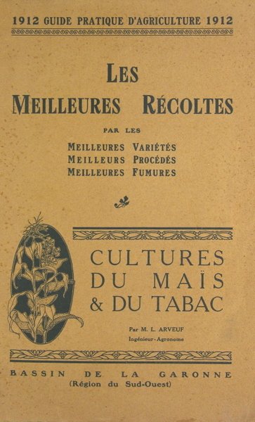 Edité par la DéLéGATION FRANçAISE des producteurs de nitrate et de soude du Chili, 1912. In/8 broché, couverture imprimée et illustrée d’une vignette, 29 p. En 1912 les cultures du maïs et du tabac étaient très importante dans la région du Sud Ouest. Cette plaquette renseigne sur les sols, la place dans l’assolement, la préparation du sol, les engrais, les semis, la transplantation, les soins les ennemis, la récolte et la préparation pour la vente.