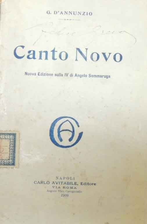Gabriele D’Annunzio, Canto Novo, Libreria Economica, Napoli 1907, nuova ed. sulla IV di Angela Somaruga, pp. 140, cm 19, br. ed. Etichetta con segnatura di collocazione al dorso, firma d’appartenenza alla prima di copertina, segnatura di collocazione al frontespizio. Tracce d’uso, sporadiche annotazioni manoscritte in bella grafia.