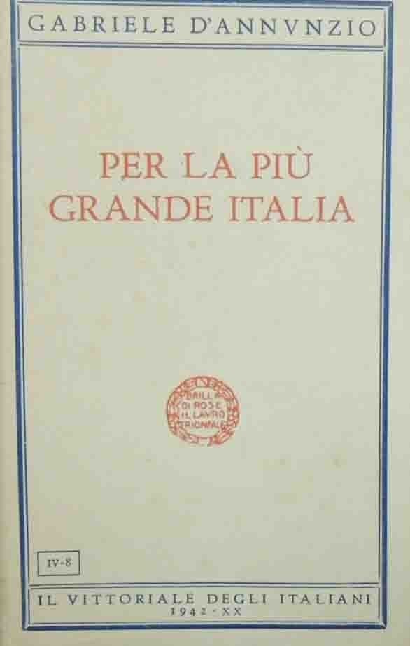 Gabriele D’Annunzio, Per la più grande Italia, Il Vittoriale degli Italiani, s.l. (ma stampato in Roma, presso le Officine dell’Istituto Poligrafico dello Stato) 1942, pp. 247, cm 20, br. ed. con sovraccoperta. Collana Prose varie, n. 8. Il volume raccoglie le seguenti opere: Per la più grande Italia – La beffa di Buccari – La fiamma intelligente. Minime fioriture, lieve brunitura della carta, per il resto molto ben conservato. Parzialmente intonso.