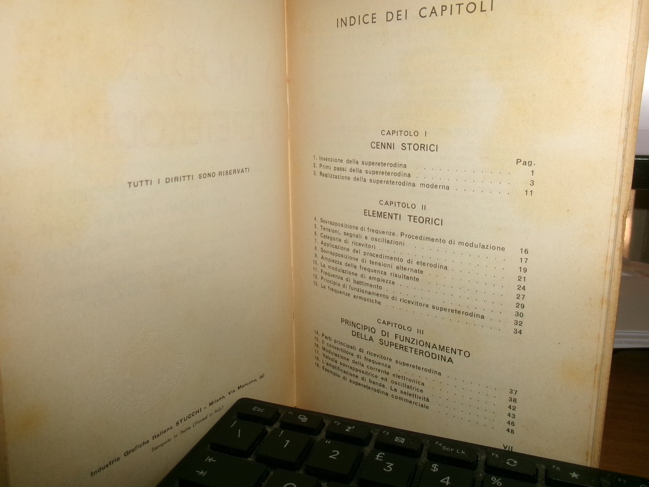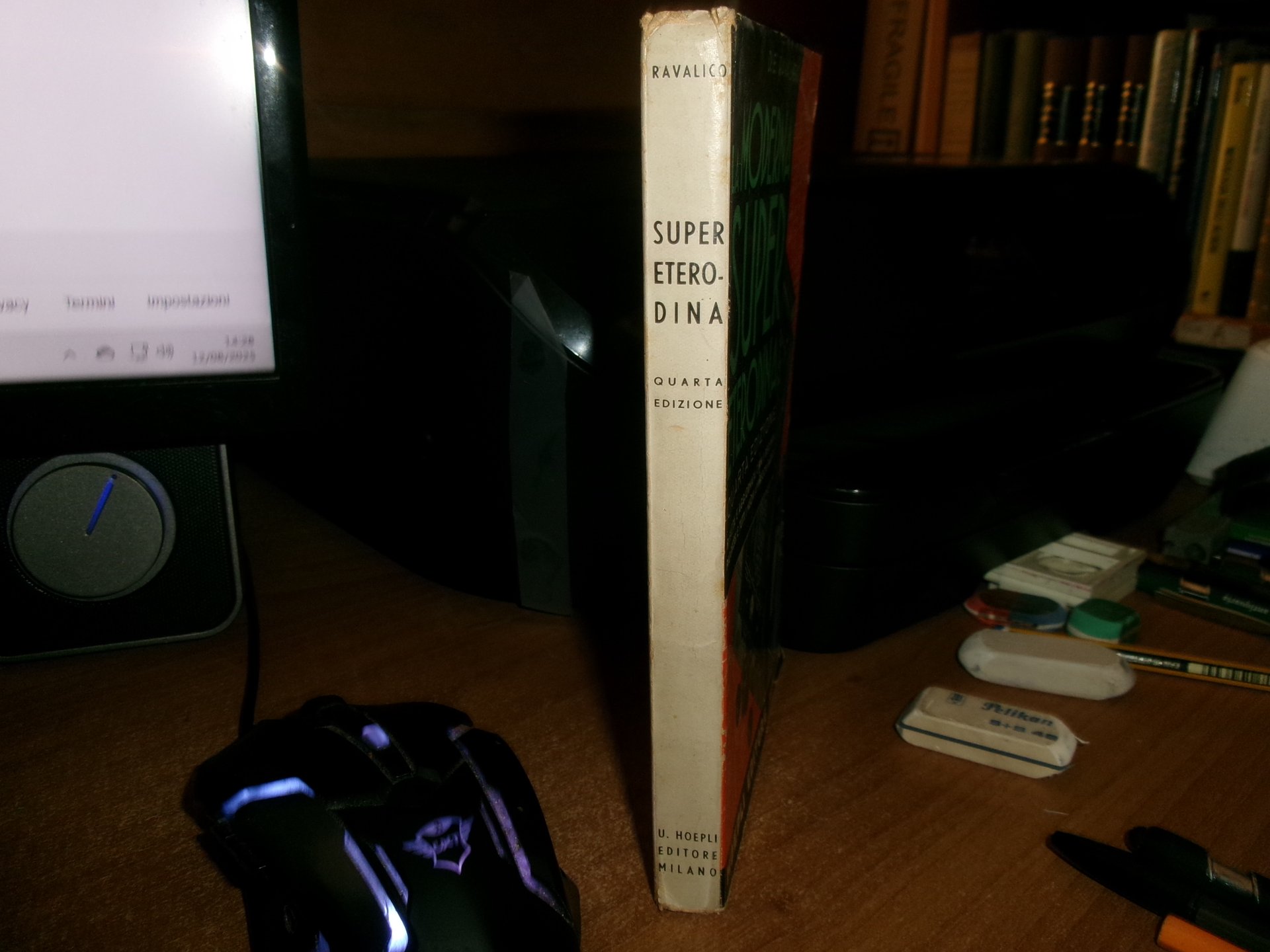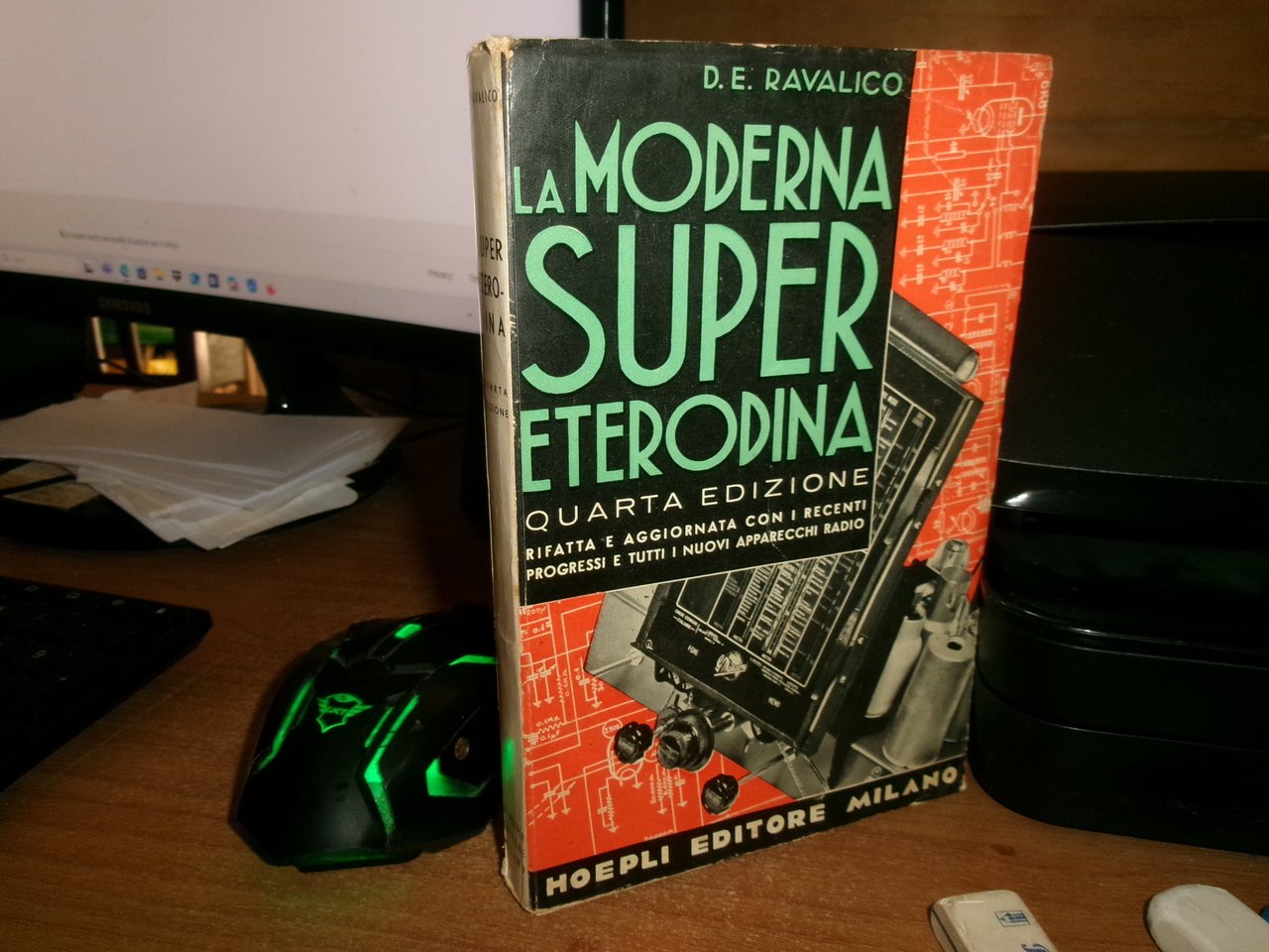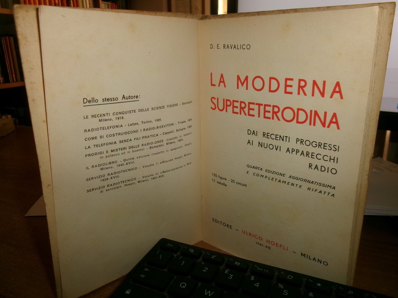 D.E. RAVALICO. La Moderna Super Eterodina quarta edizione rifatta e aggiornata con i recenti progressi e tutti i nuovi apparecchi radio. Quarta edizione aggiornatissima e completamente rifatta. Milano, Hoepli Editore, 1941. In-8° piccolo, br. edit. xii, 260, (4) pp. con 155 figure - 25 circuiti 11 tabelle. Ben conservato con firma di ex possessore nella prima bianca e lievi arrossamenti della carta. Neg. mob. 19 Hoepli.