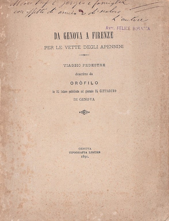 Da Genova a Firenze per le vette degli Apennini. Viaggio pedestre descritto da Oròfilo in 25 lettere pubblicate sul giornale IL CITTADINO di Genova