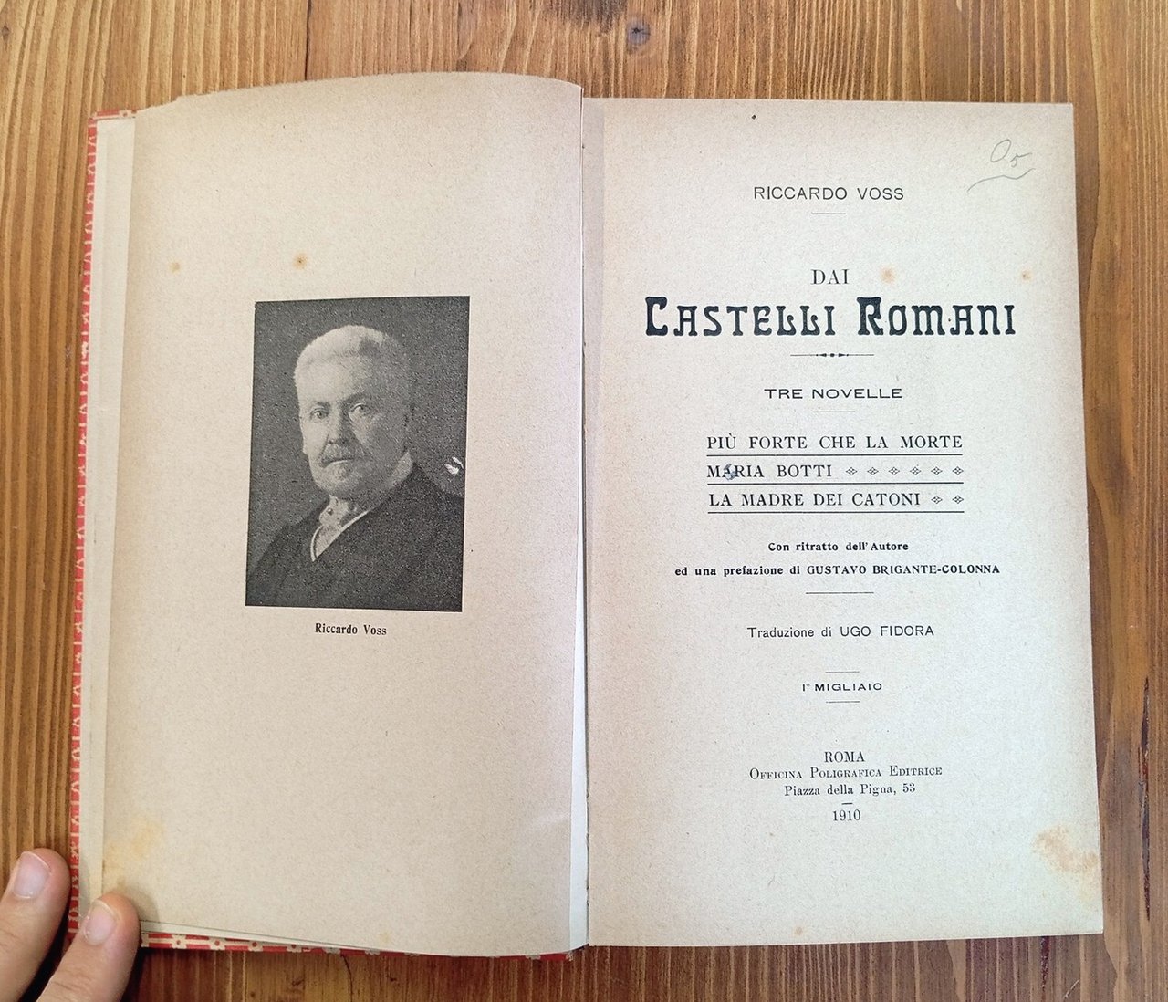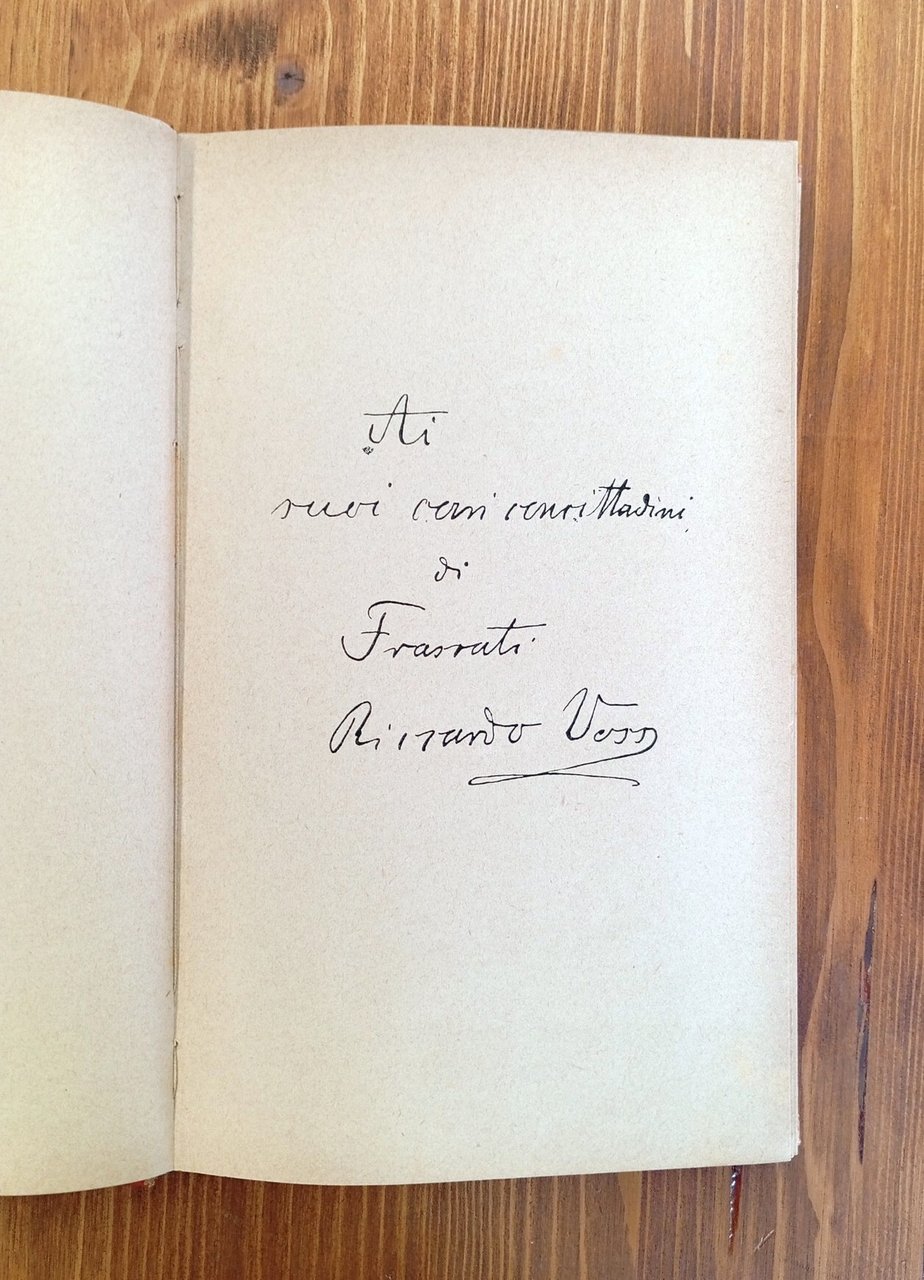 Prima edizione, 1° migliaio - Volume in legatura amatoriale cartonata con titolo in oro su tassello al dorso, XXIV- 233 pagine; ritratto dell'autore all'antiporta. Le novelle sono intitolate: Più forte che la morte - Maria Botti - La madre dei Catoni. Prefazione di Gustavo Brigante-Colonna, traduzione dal tedesco di Ugo Fidora. Volume dedicato dall'autore ai suoi "cari concittadini di Frascati", come recita l'autografo riprodotto in facsimile prima del testo. In apertura è presente un invio autografo del traduttore (1911), cui segue una successiva nota privata sul passaggio di proprietà del volume (1964). Ordinari segni del tempo, ma nel complesso ottimo esemplare di un volume piuttosto raro -- Richard Voss (Neugrape, 2 settembre 1851 – Berchtesgaden, 10 giugno 1918) è stato uno scrittore tedesco; con la moglie visse per venticinque anni a Frascati presso Villa Falconieri, imparando bene l'italiano e frequentando la comunità tedesca di Roma.