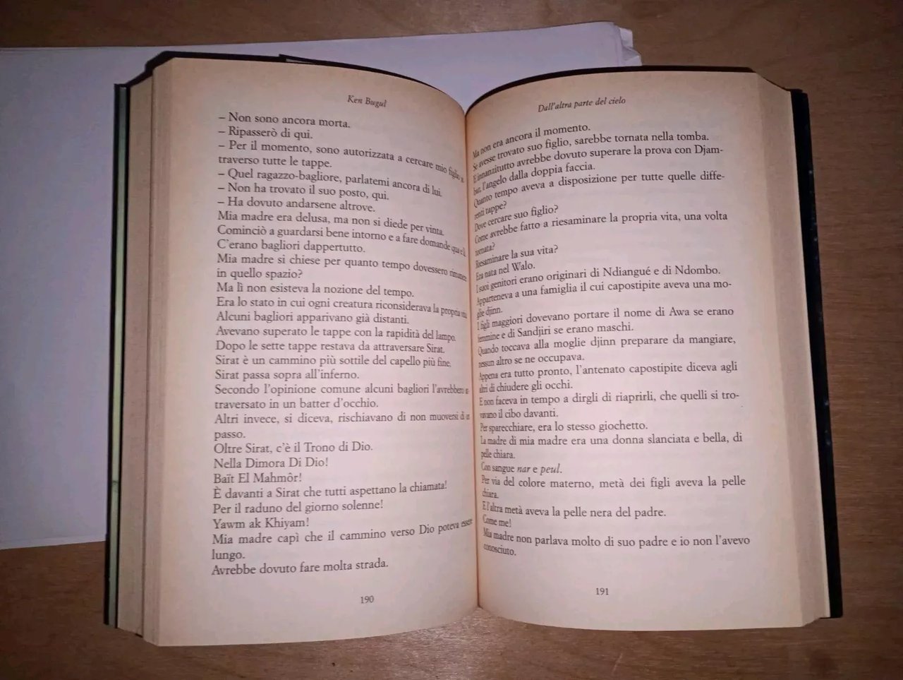 KEN BUGUL, dall'altra parte del cielo - Baldini Castoldi Dalai, 2004Una storia raccontata in prima persona, un lungo monologo in cui la nostalgia per la perdita della madre si alterna alla collera e alla frustrazione. Una madre che dopo aver lasciato la propria famiglia per ragioni misteriose, ha abbandonato la figlia a soli sette anni in una stazione per occuparsi di Samanar, la figlia della sorella. Il romanzo ricostruisce una fitta e complessa rete di legami familiari, in cui fratelli e sorelle, zii e nipoti danno voce a memorie spesso sepolte. L'autrice riesce a raccontare la morte della madre, le visite al cimitero, il dialogo con chi, pur avendola abbandonata e privata del suo amore, le ha donato la vita.