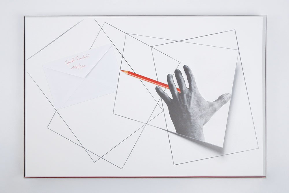 - pp. 159 [1], sguardie mute in carta rossa, un bifoglio 40 x 60 cm. contenente la nota biografica e una tavola 40 x 60 cm. con collage e stampa litografica a colori su carta fustellata, velina protettiva sottodimensionata per la tavola,