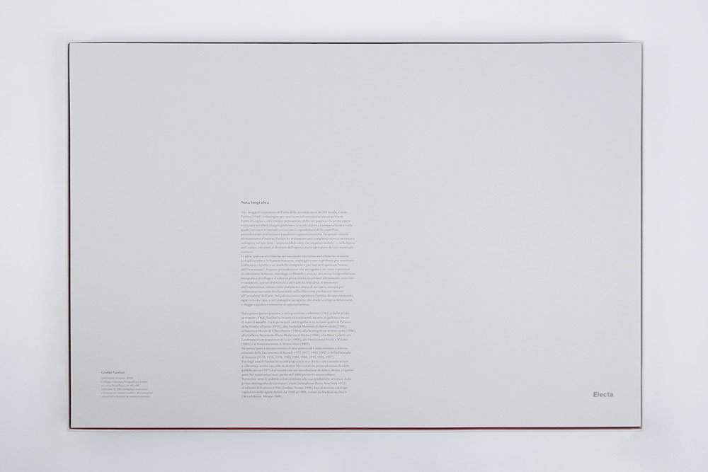- cartonato bianco con titoli in nero e rosso al piatto superiore e al dorso e sinossi alla quarta di copertina, conservato all’interno di un cofanetto editoriale 40 x 60 cm. color grigio chiaro con pecetta recante autore e titolo al piatto superiore, interni in cartoncino rosso,