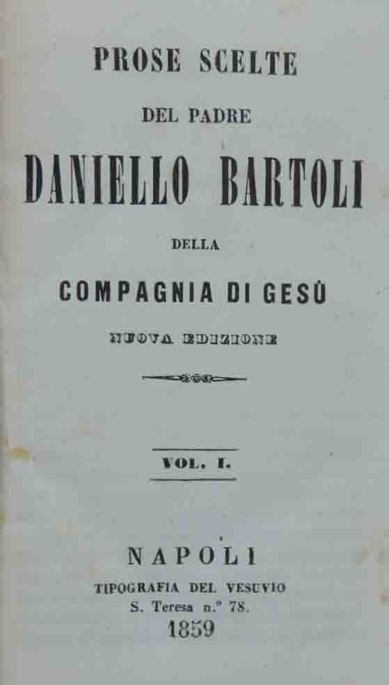 Prose scelte del padre Daniello Bartoli della Compagnia del Gesù, Tipografia del Vesuvio, Napoli 1859, nuova ed., 3 voll. legati in un unico tomo, pp. 711, cm 15, elegante legatura in tutta tela con tagli spruzzati, titoli e fregi in oro al dorso e decorazioni a impressione ai piatti. Legatura leggermente scolorita, minime fioriture, per il resto perfetto.