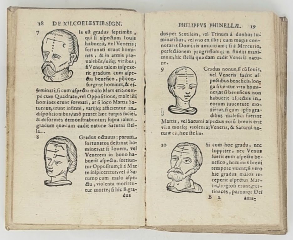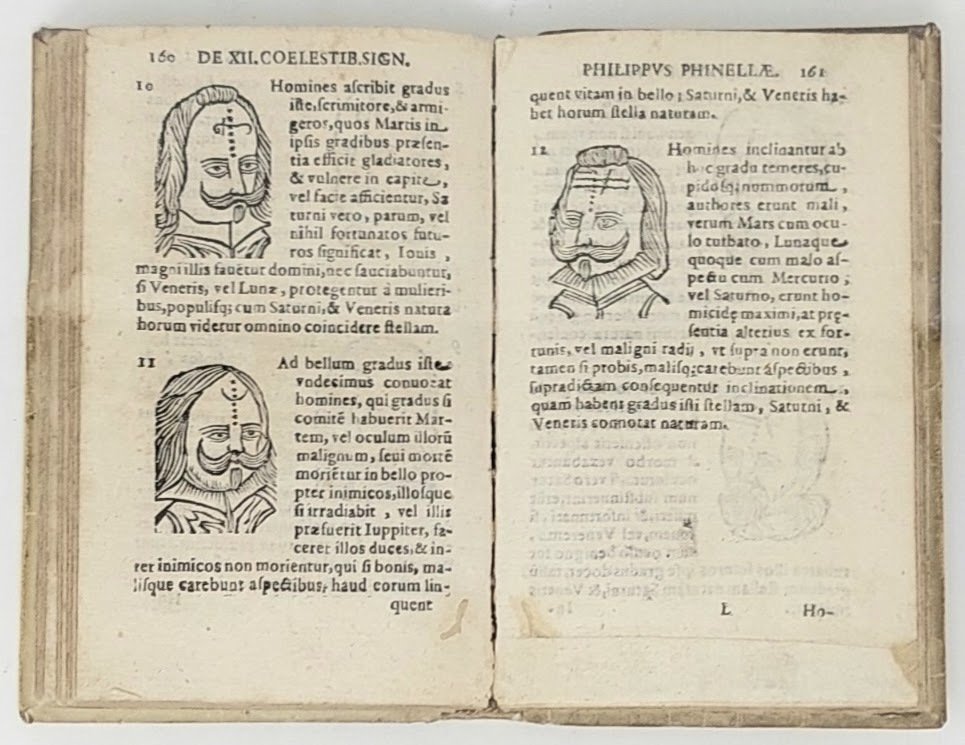 >in-16, pp. (8), 248, legatura coeva in pergamena, titolo e fregio maniscritti su dorso a nervi. Prima e probabilmente unica edizione, rara, di questo trattato di fisiognomica e di astrologia in cui l'autore cerca di stabilire le corrispondenze sull'animo umano tra le influenze astrologiche e le proprietà caratteriali. Una serie di 357 xilografie n.t. illustrano le teorie del Finella. Precede l'opera dedica dell'a. a Carlo Oria Caretti, duca di Tursi, generale della flotta di Gaeta del re di Spagna. Il napoletano Finella fu autore anche del ''De Planetaria Naturali Phisonomia'', stampato a Napoli nel 1649; a lui si attribuisce la scoperta dell'estrazione dei sali dai vegetali, dagli animali e dai minerali. Discreto esemplare (piccoli fori di tarlo nel margine inferiore della parte centrale del volume), timbro di biblioteca estinta al titolo. Caillet II, 8632. Manca a Dorbon. Cat. Vinciana 2182. Cantamessa I, n.2620.