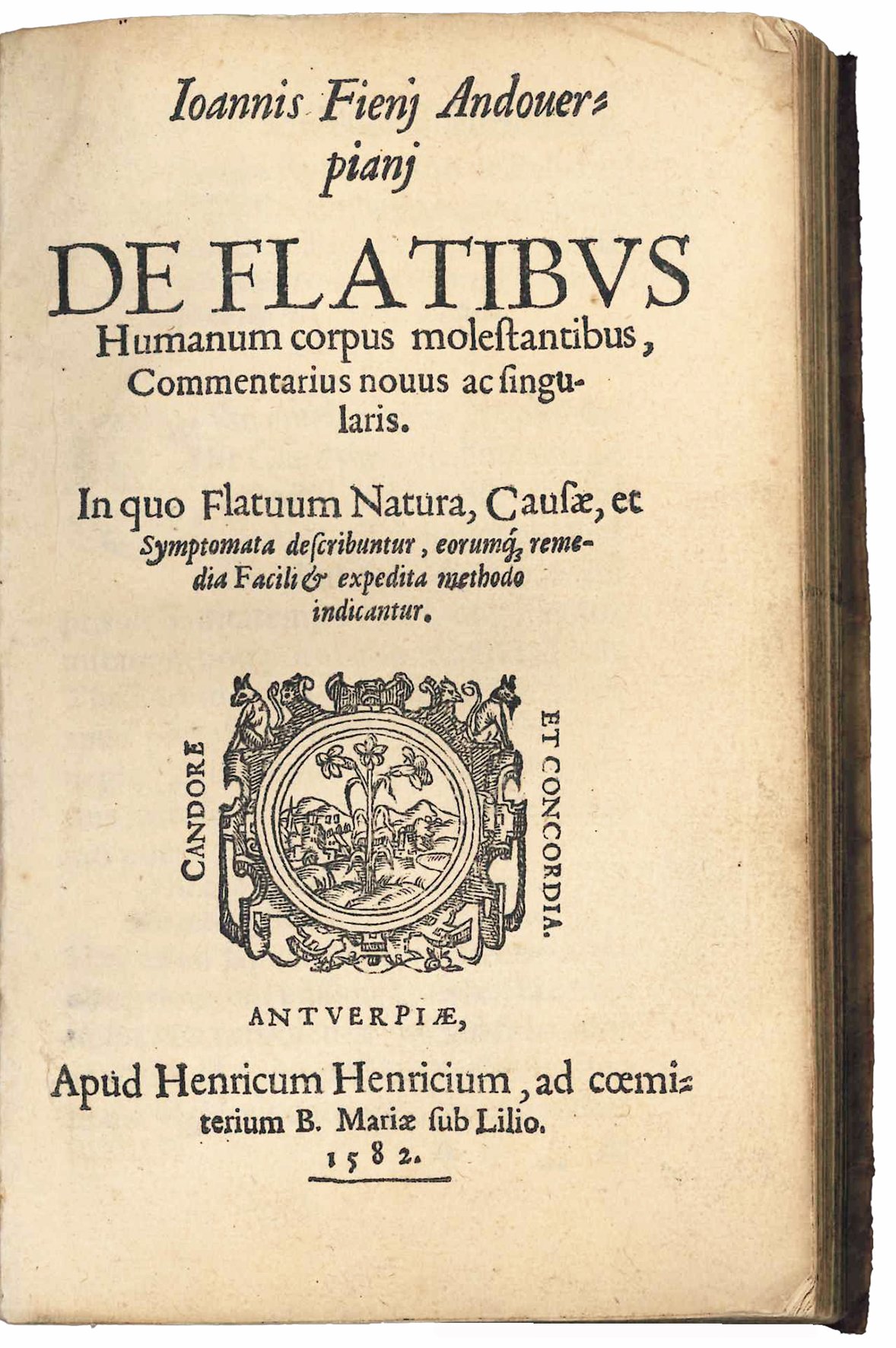[...] De flatibus humanum corpus molestantibus, commentarius novus ac singularis. In quo flatuum natura, causae, et symptomata describuntur, eorumque remedia facili & expedita methodo indicantur. Antverpiae, apud Henricum Henricium, ad coemiterium B. Mariae sub Lilio, 1582 (Colophon: Antverpiae, Henrico Henricio, excudebat Ioannes Ghelius Iunior, 1582)