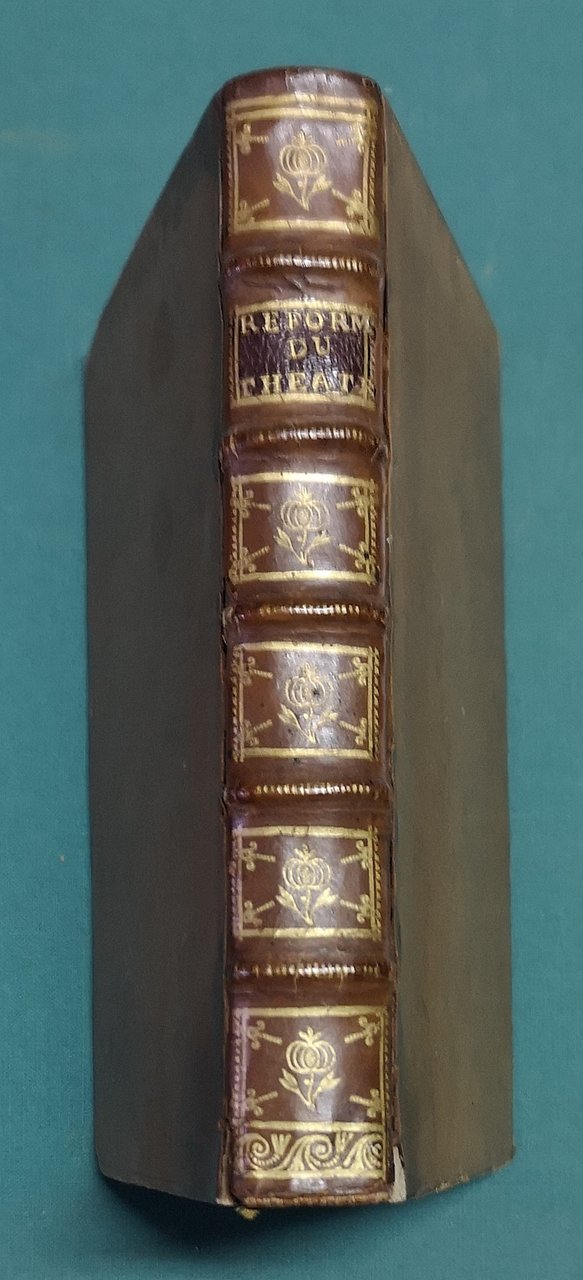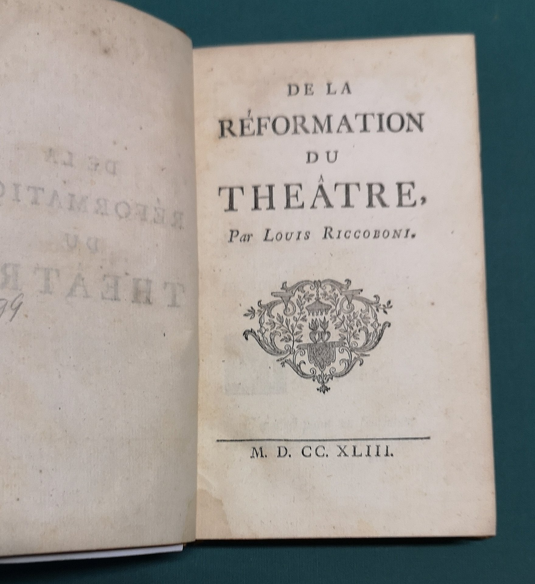>in-12, pp. XXIII, (1b.), 337, (7), leg. del tempo in vitello biondo, dorso a nervi con tit. e fregi oro, tagli rossi. Dedica dell'a. ad ''Elisabeth Première Impératrice de toutes les Russies''. Prima edizione di questo trattato critico nel quale Riccoboni manifesta ormai stanchezza e declino e soprattutto rigidità morale. ''Lelio intendeva fornire una sintesi teorica definitiva; purtroppo questa estrema sublimazione dei suoi rancori e delle sue aspirazioni di uomo di teatro risente degli eccessi di una religiosità troppo invadente e scrupolosa...; in generale: il punto di vista morale domina ormai in modo esclusivo nella sua requisitoria...'' (Encicl. Spettacolo VIII, 942). Tra l'altro, l'autore condanna l'amore profano, per troppo tempo unico argomento dell'intreccio, e addirittura la presenza stessa delle donne sul palcoscenico...Propone l'autorità dello Stato, quale unica artefice della riforma teatrale, la quale dovrà attenersi ai nove articoli da lui dettati: reclutamento della compagnia, matrimonio obbligatorio per le attrici, comitato di censura, intrecci senza amore, ecc. Ottimo esemplare (ma legatura con cerniere deboli). De Courville n. 85. Soleinne V, 41.