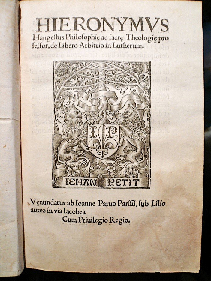2 opere in un volume in-4° piccolo (18,1x12,2cm). (4)+XCVI carte. Bella marca di Jehan Petit al frontespizio (8,2x6,3) e grandi capilettera miniati. La data di stampa si desume dal privilegio rilasciato al Petit ed erroneamente datato 1515: faict imprimer: de ce iour dhuy.viii.iour Doctobre Mil cinq cens.xxvii. Rara opera dell'Hangest sul Libero Arbitrio contro le idee luterane e in merito alla controversia in atto tra Erasmo e Lutero. OPAC SBN IT/ICCU/BVEE/016995. Legata con: Hangestus, De possibili praeceptorum divinorum impletione in Lutherum, 1528. XXIIII carte. [Perdita di testo alle ultime 3 righe di Fo.XXIII]. Bella marca di Jehan Petit al frontespizio (10,8x8,2) e grandi capilettera miniati. OPAC SBN IT/ICCU/RMLE/005566 Rara opera dello Hangest contro le idee luterane. Legatura moderna in pelle marrone con decori a secco, imitante le legature rinascimentali.Tagli rossi. Hangest, teologo francese ( + 1538). Nato a Parigi, insegnò all'Università della Sorbona. Fu scelto dal cardinale Louis de Bourbon, vescovo di Mans, come suo vicario e in tale veste si fece notare per la profondità della preparazione teologica e per lo zelo contro gli errori della dottrina protestante.