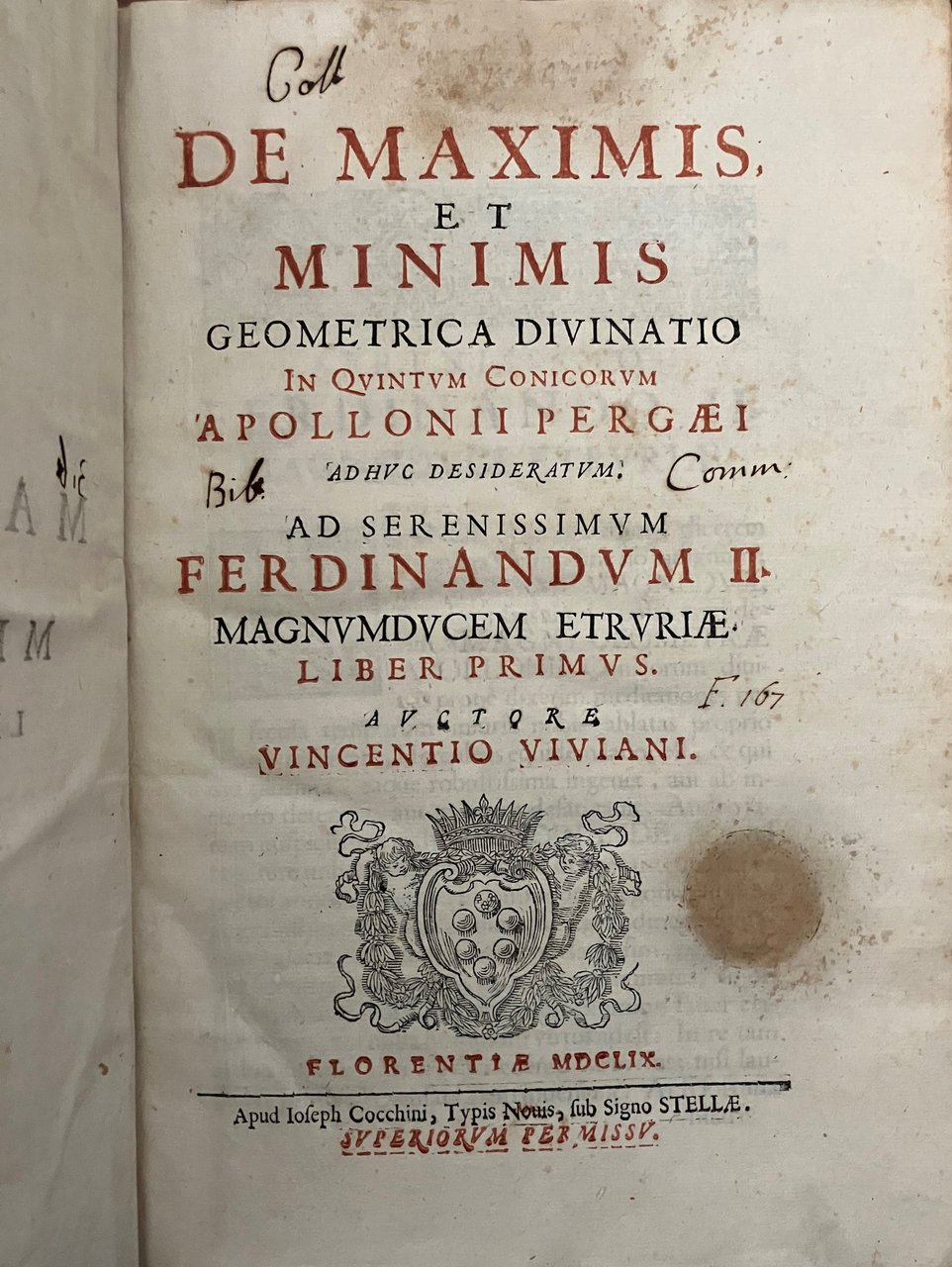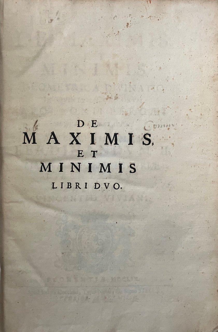 "De Maximis et Minimis" greatly influenced the development of 17th century European mathematics. Viviani’s ideas were an important contribution to the development of calculus, a mathematical field that would reach its peak with the work of mathematicians such as Isaac Newton and Gottfried Leibniz in the following century. Cinti 135. - Riccardi I/2, 625 ("raro e pregiato"). - DSB XIV, 49 f.