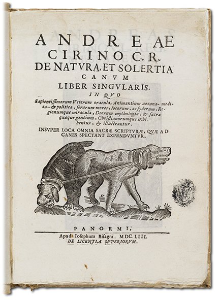 >in-4 (mm 235x170), pp. VIII, 347, (1b). Perfetto cartonato rustico originale con titolo manoscritto nella parte superiore del dorso. Silografia di due cani sul foglio di titolo, al recto del secondo foglio figura di Diana con cani, al verso altra figura di cane seduto. Il testo è illustrato da 26 belle incisioni in silografia raffiguranti esemplari delle razze canine al tempo conosciute. Alcuni capitoli del raro trattato concernono la caccia: ''De cane leporario, et veloce - De vestigatione canum in venatu - De cane venatico - De cane acquatico, et aucupe - Miscella de canum natura, et venatione - De venatione cum canum''. Prima ed unica edizione di una delle prime monografie di cinofilia Cirino (1618-1664), assai rara anche essendo impressa a Palermo, e riccamente illustrata. Solo 4 esemplari completi censiti in biblioteche italiane. Il Cirino pubblicò a Palermo nel medesimo anno un trattato "De venatione et natura animalium". Magnifico esemplare a fogli chiusi, freschissimo con nitidissime incisioni; abile restauro al margine superiore di alcuni fogli del primo quaderno, stemma di antica collezione privata al titolo. B:Museum XVII sec., 238. Souhart 103. Ceresoli 158. Schwedt, I, 112. Manca a Michel-Michel. ''L'opera è affascinante ed unica nel suo genere e si occupa oltre che dei cani e del loro addestramento alla caccia, anche di animali selvatici. Le illustrazioni sono divertenti e curiosissime, di un'ingenuità e di un sapore particolare... Opera che Ceresoli dichiara rarissima''(Moncada, Bibl.Siciliana)