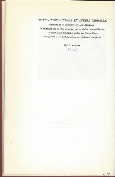 Gebonden, linnen, vergulde bandstempel, rug versierd met vergulde titel, 15,5x23,5cm, 211 pp. Een bloemlezing uit de vertellingen van Lode Baekelmans ter gelegenheid van de 75ste verjaardag van de schrijver, met woord vooraf door Marnix Gijsen. E n van de 500 genummerde exemplaren.