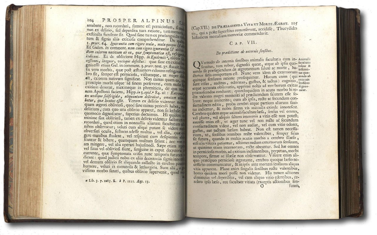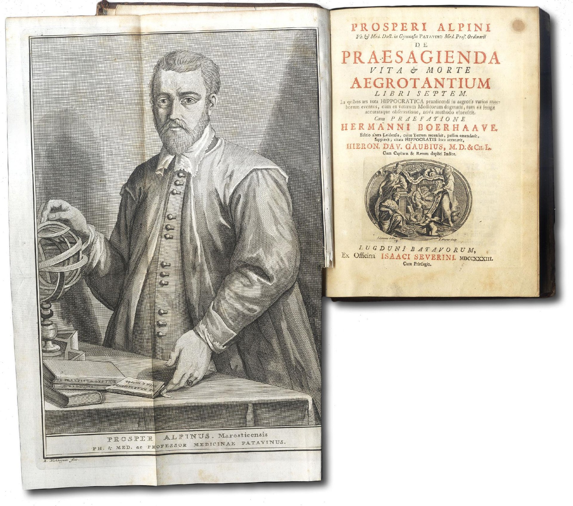>in-4 picc., pp. (22), 558 (con 6 pp. aggiunte: 184 A-F), (46), leg. del tempo p. pelle, dorso a nervi con tit. e ricchi fregi oro (piccoli difetti agli spigoli). Frontesp. a stampa rossa e nera con marca tip. inc., grande ritratto dell'autore da R. Blokuysen inc. in rame ripieg. f.t. Dedica del curatore H.D. Gaubius al Boerhaave. Bella ed accurata edizione (la prima era apparsa nel 1601) di questo celebre trattato di diagnostica e semeiotica medica, il primo dopo Ippocrate e Galeno. Prospero Alpini (Marostica, Vicenza, 1553 - Padova 1617) fu illustre medico e professore di botanica a Padova e Parigi. Bell'esempl. Wellcome II, p. 36. Garrison-Morton 2194.