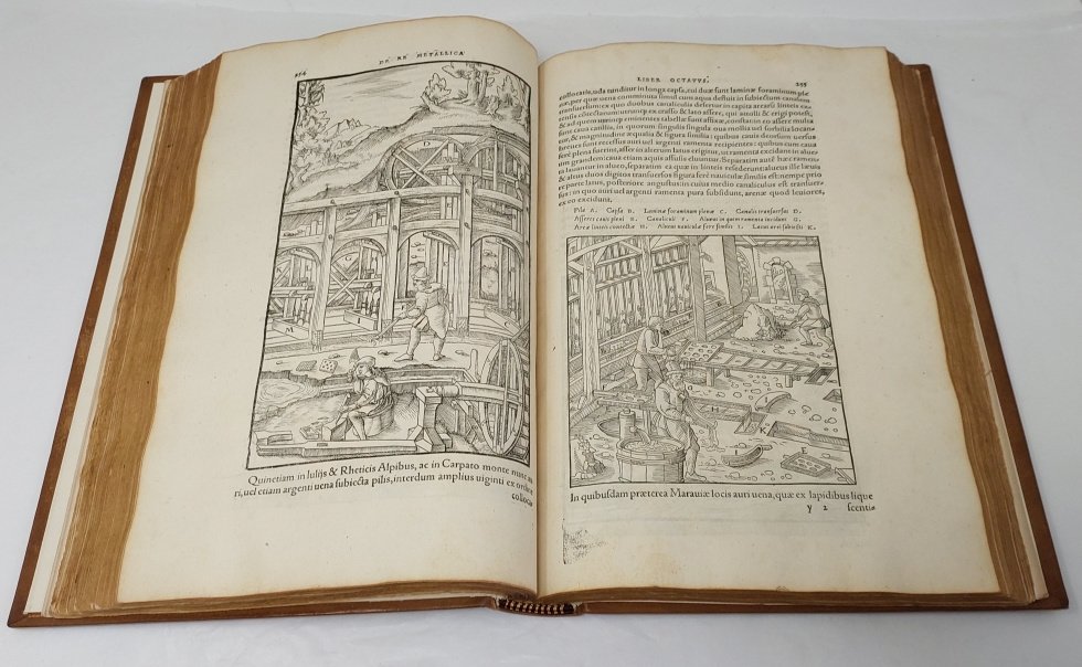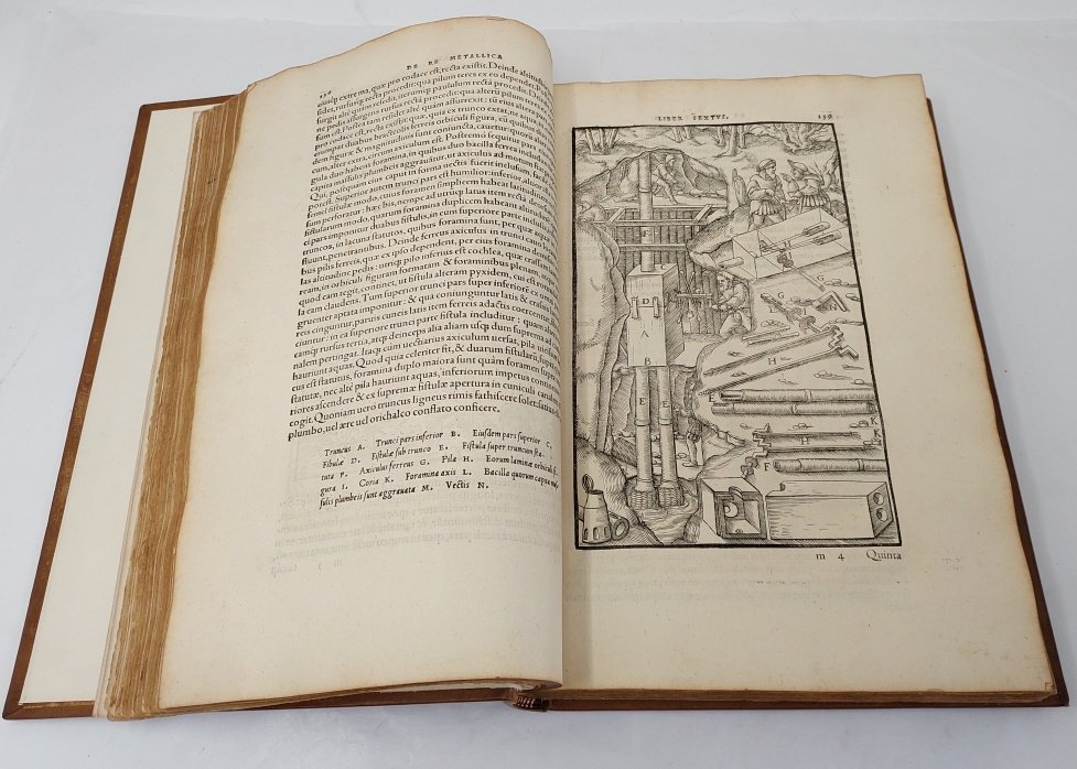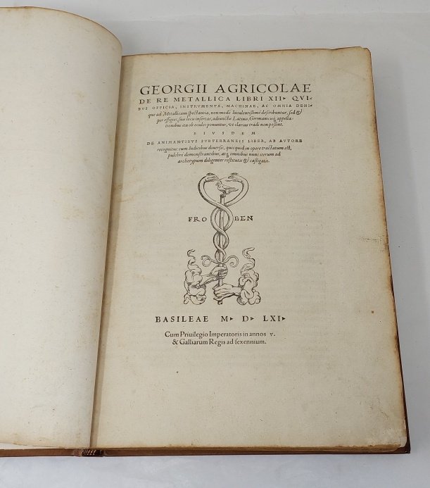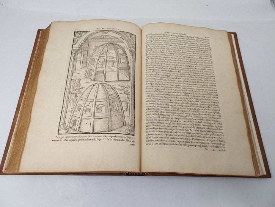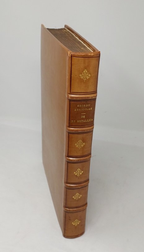 >in-folio, ff. (6, sesto bianco), pp. 502, ff. (37, Index), splendidamente illustrati in silografia da 2 tavole fuori testo, 273 grandi fig. n.t, vari capilettera istoriati, emblema di Froben sul titolo e in fine. Bella legatura moderna in pieno vitello biondo, dorso a nervi con titolo e fregio in oro negli scomparti, tagli bruni. Seconda edizione latina (prima 1556 del medesimo Froben) della monografia fondamentale sulla scienza dei metalli. Le magnifiche incisioni, a piena o mezza pagina, sono assegnate agli artisti Hans Rudolf M.Deutsch e Blasius Weffring; illustrano ogni aspetto della metallurgia e mineralogia, particolari di macchine e atrezzi, scene di lavorazione, tecnologie specifiche, etc. Ogni aspetto del lavoro sotterraneo e di officina, e di applicazione dei macchinari inventati, è accuratamente descritto nei dodici capitoli che compongono l'opera. (''De re metallica remained the standard text-book on mining and metallurgy for over two-hundred years'' - Norman catalogue). Esemplare assai bello, a larghi margini. Hoover Coll. 17 e 19: «The first systematic treatise on mining and metallurgy» . Horblit, 100 books in science 2b. PMM 79.