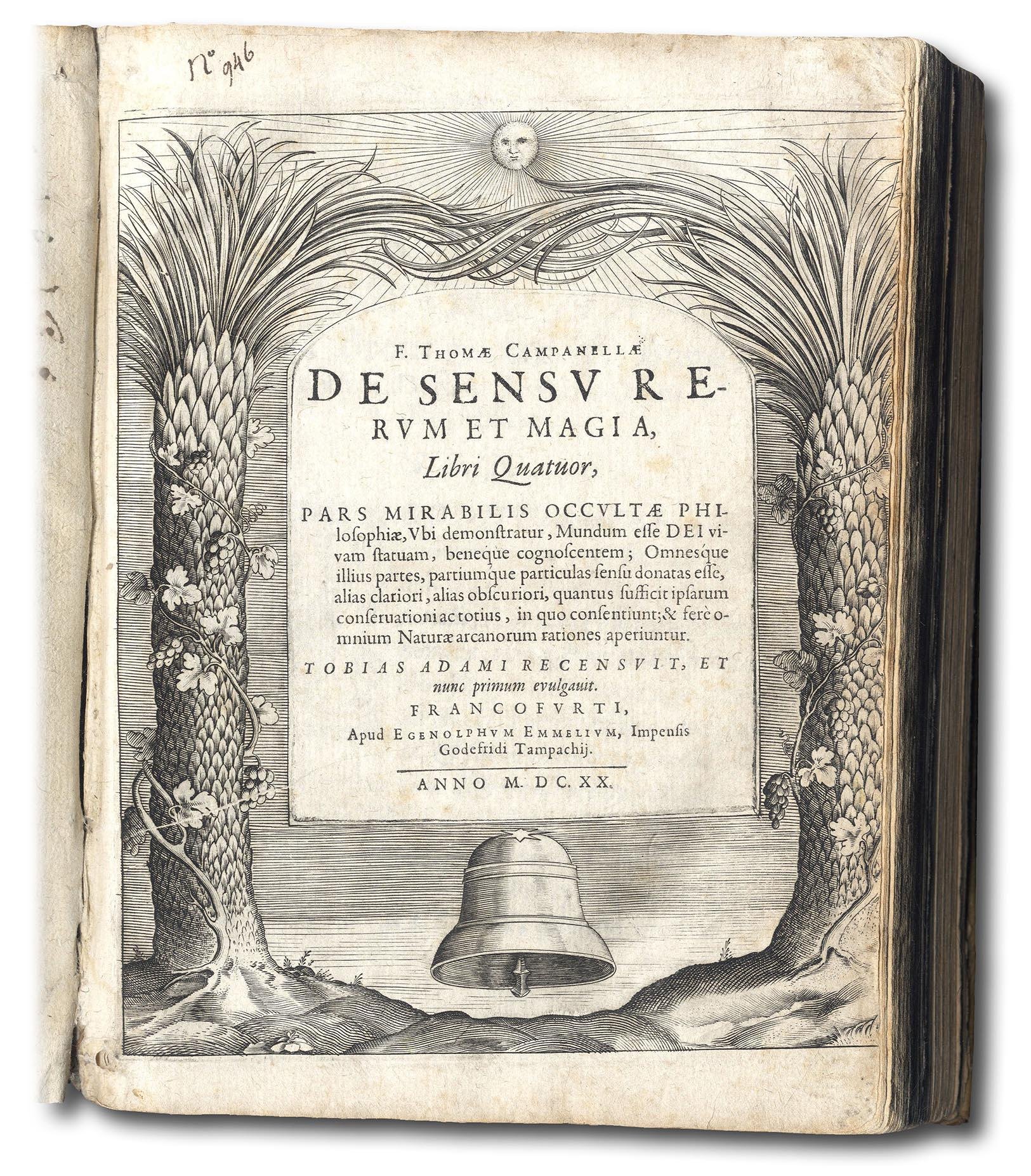 >in-4 (mm 224x159), pp.(16), 372 (ultima bianca), leg. coeva in pergamena. Pagina di titolo racchiusa da un'elaborata bordura incisa e raffigurante il sole, alberi di palma e una campana. Prima edizione, assai rara e pregiata, di una delle opere più studiate e influenti del filosofo, al quale costò la prigione e la tortura, su condanna dell'Inquisizione per eresia. Il De Sensu Rerum rappresenta un completo esposto di filosofia neo-platonica ed ermetica. Campanella ivi tenta di dimostrare che il numero dei mondi è infinito, che i pianeti sono abitati e che il sole si avvicina gradatamente alla terra. Discute inoltre di magia, dei sensi, dell'intelletto, dell'anima, del mondo esterno, ecc. Il trattato lascia intuire di essere stato influenzato dalla linea filosofica di B. Telesio e G. Bruno. Scritto originalmente nel 1590-92, il manoscritto venne rubato a Campanella da alcuni frati a Bologna. Venne quindi riscritto dallo stesso autore attorno al 1604 e pubblicato nella presente edizione originale nel 1620.